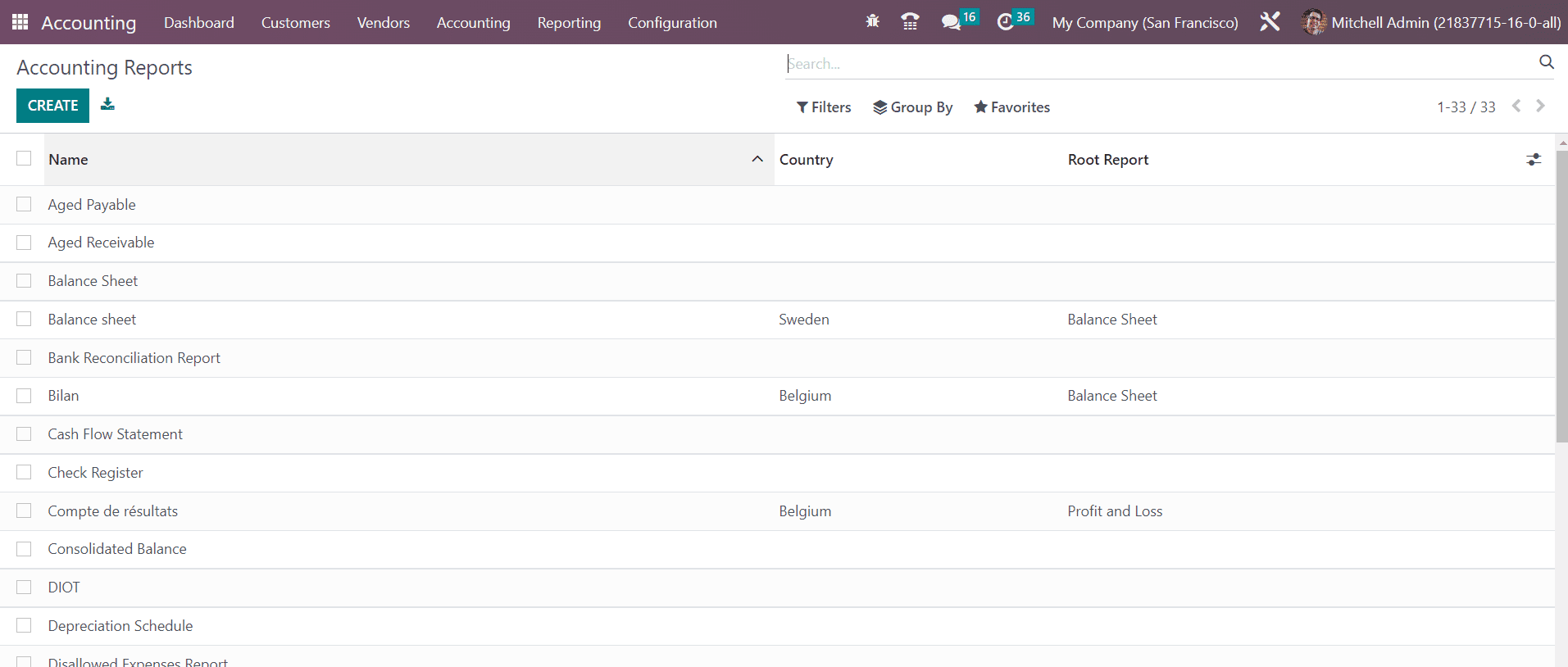For making the reports more informative and understandable, Odoo offers a new feature for customizing your accounting reports. If you want to customize the accounting reports of your company according to your requirements, you can go to the Accounting Reports option given under the Configuration menu of the Accounting module. This platform will assist you in creating reports that suit your needs. You can change the configuration of the already existing reports also by selecting the corresponding one from the given list, as shown below.