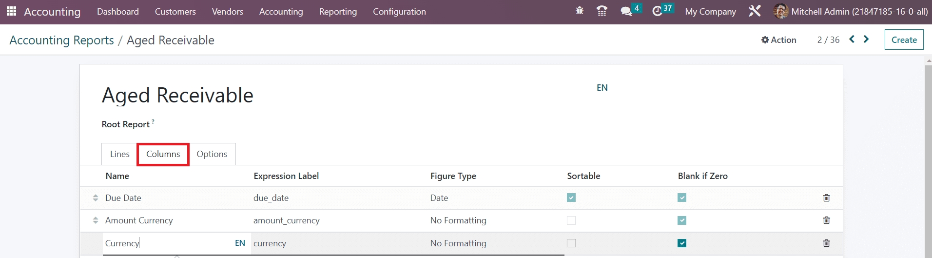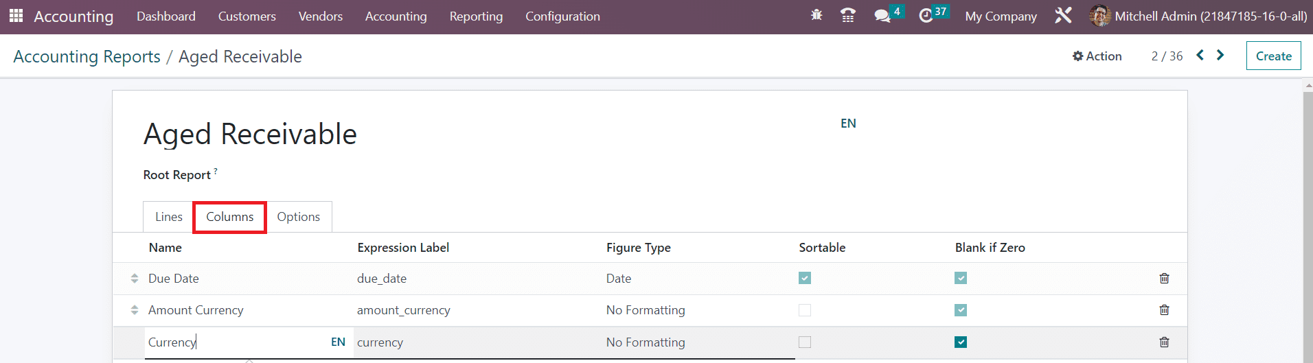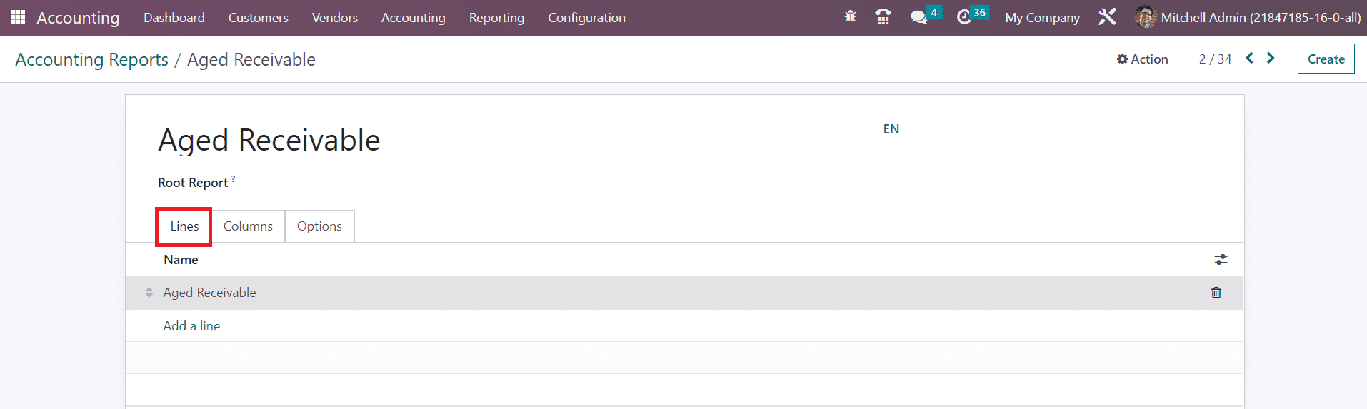 Now, let’s create a new column for the report. Under the Column tab, you can create new columns for the Aged Receivable report by clicking on the Add a Line button.
