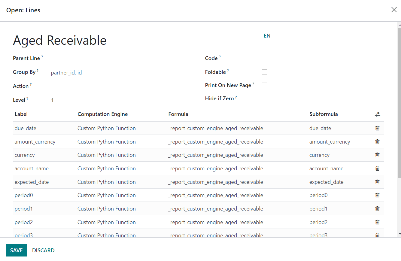 Here, we are creating a new report line called Aged Receivable in our financial report. In the Partner Line, you can specify the partner id of this reporting line. A separate list of fields will appear in the report line by mentioning the keys in the Group By field. If you want to turn the report line into a link, you can use the Action field. The Level field will show the hierarchical level of this report line. You can specify a unique identifier for this line in the Code field. By activating the Foldable field, a folding button will be displayed on the report to fold this line. When the Print on New Page button is activated, everything after it will be printed on a new page. By enabling the Hide if Zero feature, Odoo will automatically hide the line when all of its columns are 0. Using the Add a Line button, you can specify the Label, Computation Engine, Formula, and Subformula.