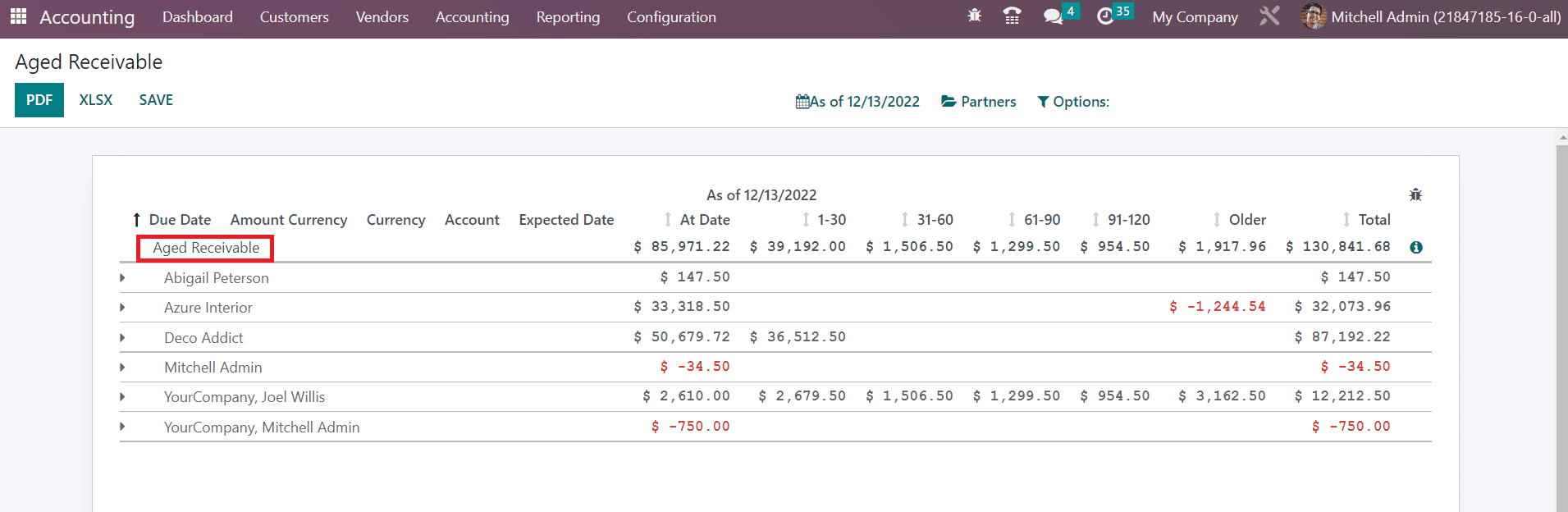 After creating a new line, you can observe the new reporting line in the Aged Receivable report as shown below.