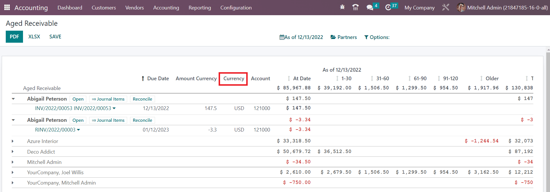 As shown in the image above, the new column Currency will be available in the Aged Receivable report.