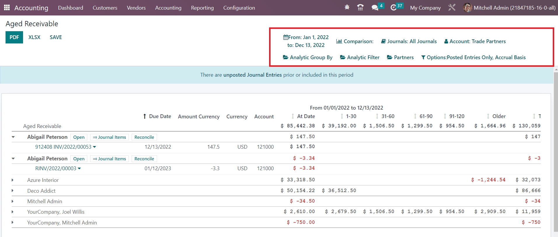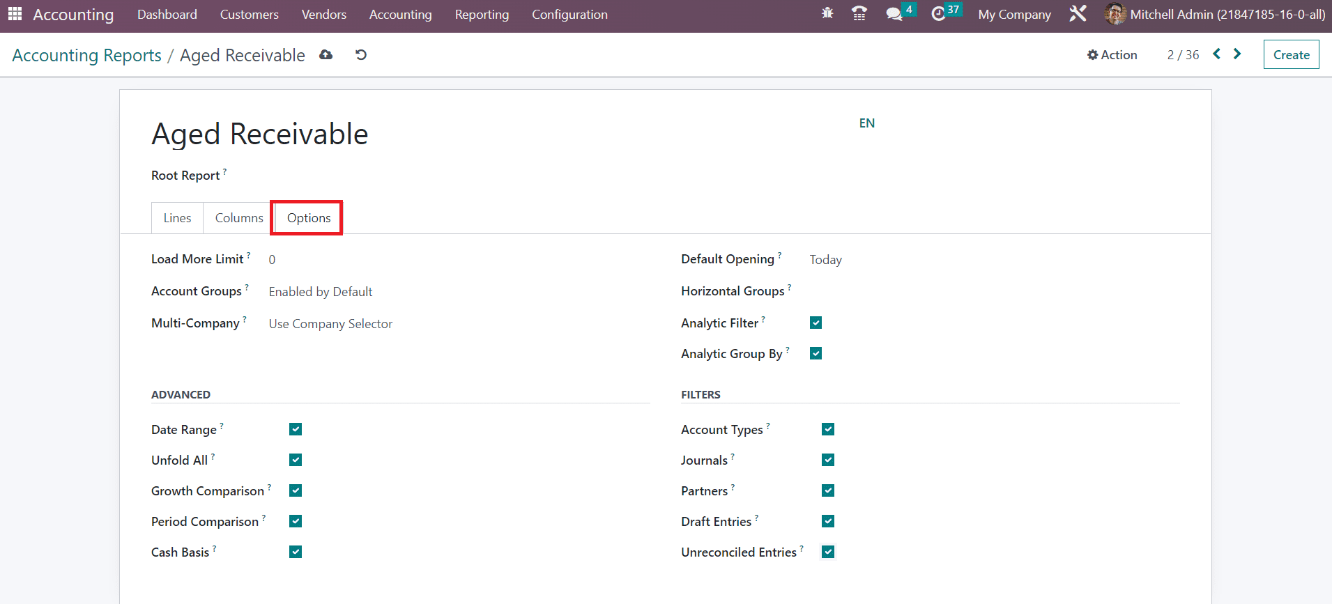 If you want to show the Date Range, Unfold All, Growth Comparison, and Period Comparison features on the Aged Receivable report, you can activate the corresponding fields from the Advanced session. Activating the Cash Basis field will display the option to switch to cash basis mode. In order to add additional filters to the report, you can enable the Account Types, Journals, Partners, Draft Entries, and Unreconciled Entries from the Filters session.