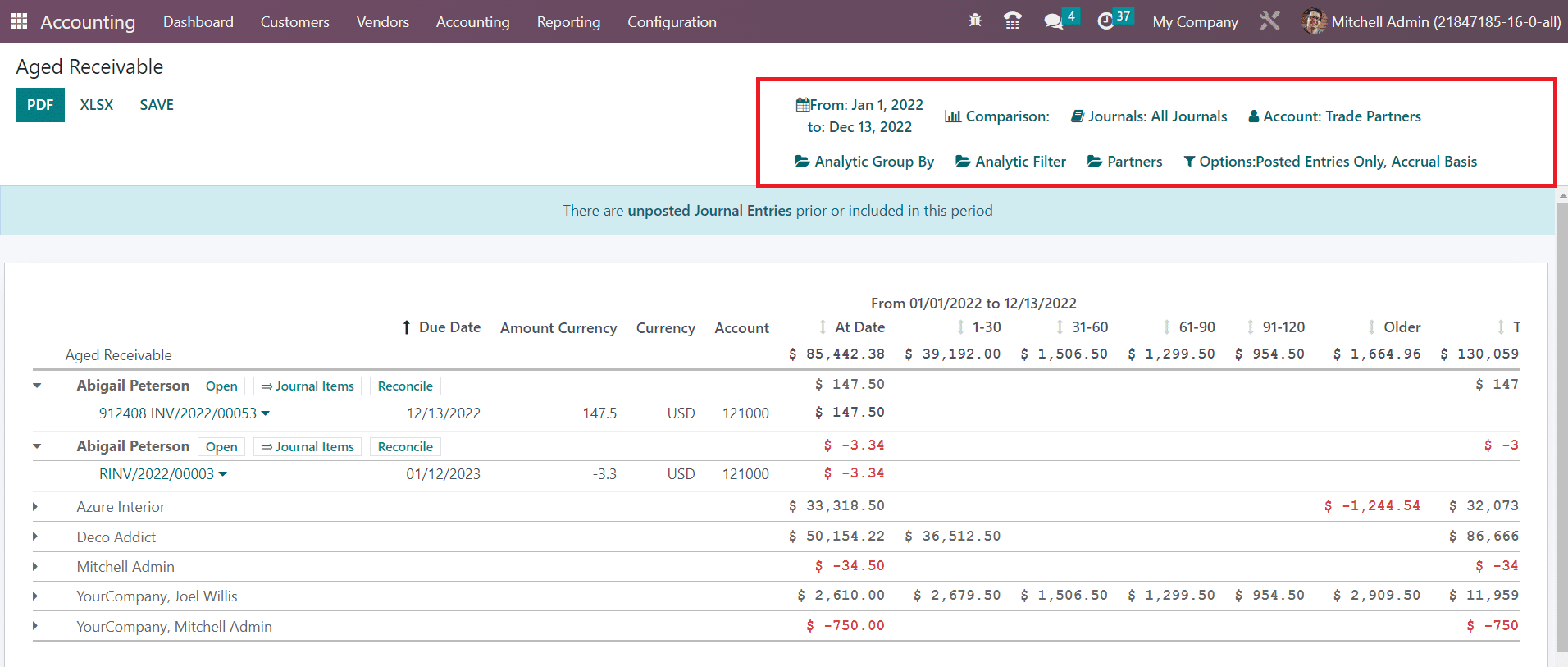 After making the necessary changes in the settings of the Aged Receivable report, you can observe corresponding changes in the reporting platform as shown in the image below.