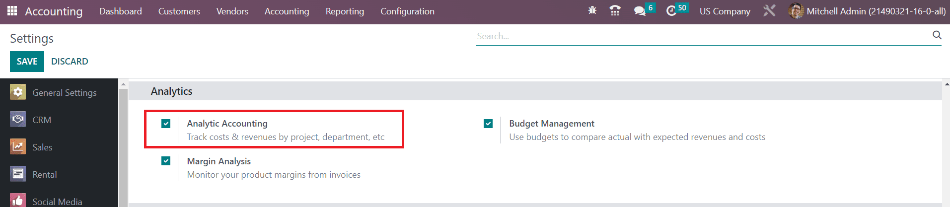 In order to keep track of specific costs and revenues, you can use the Analytic Accounts feature available in the Odoo Accounting module. You can create a chart of analytic accounts in your system for recording particular analytical entries as per your business requirements. These accounts are linked to the general accounts in Odoo but treated independently. In order to get this feature in your Accounting module, you have to activate the Analytic Accounting option from the Settings menu of the module.