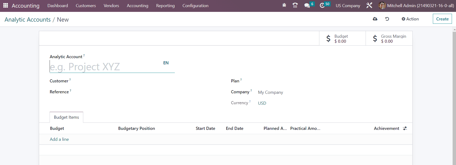 It is easy to configure a new analytic account in the Accounting module. Click on the Create button to get a new configuration window as depicted below.