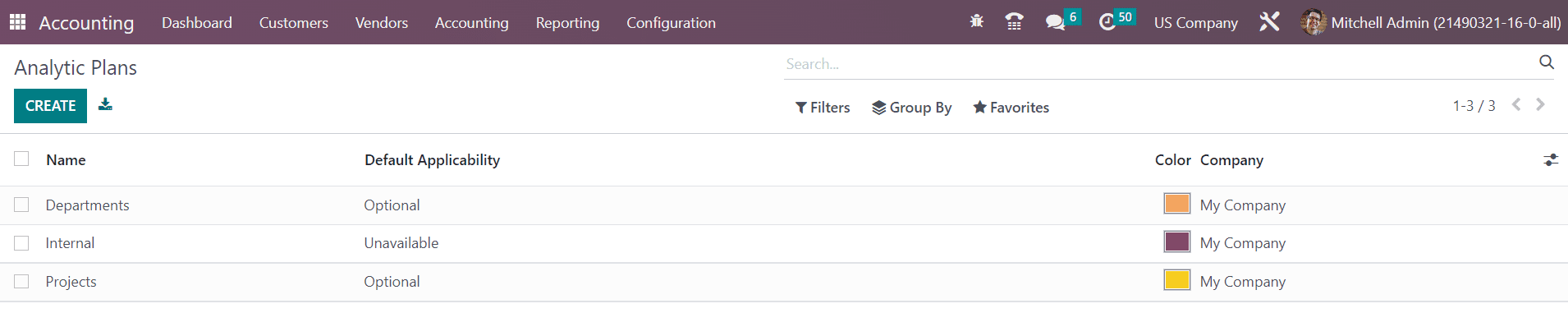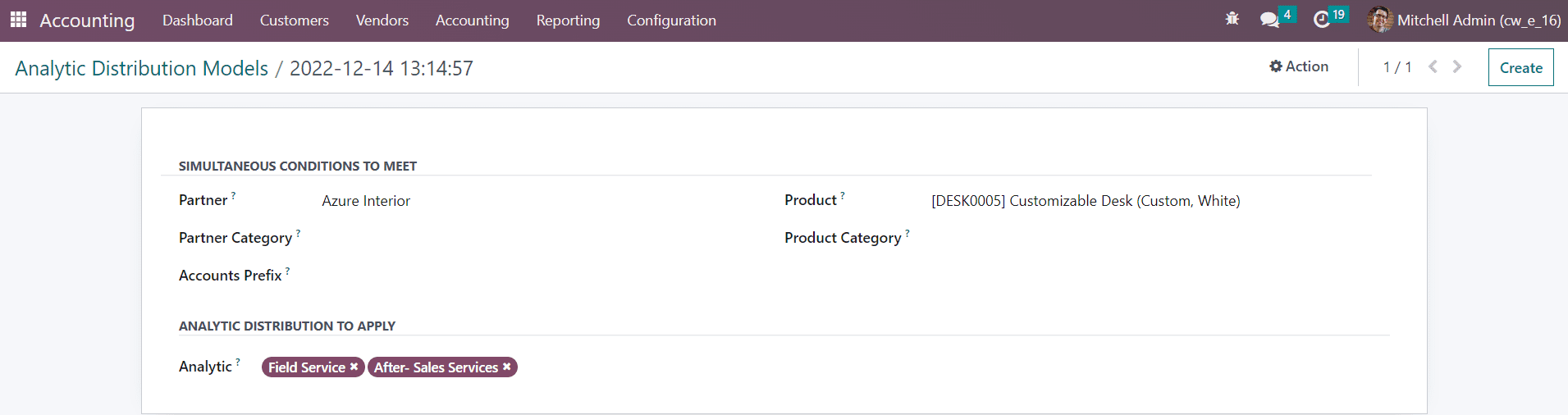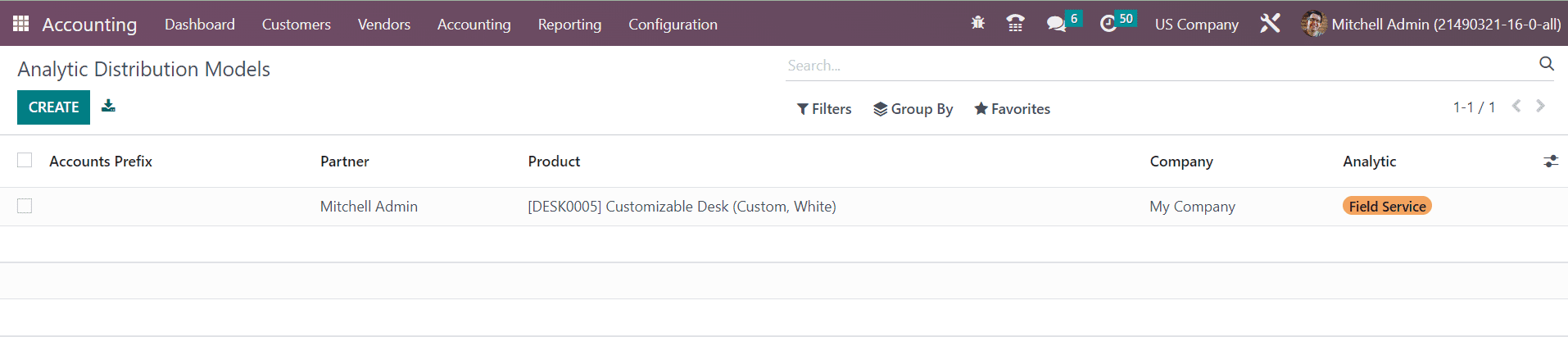 The preview of the list shows the details of the Accounts Prefix, Partner, Product, Company, and Analytic of each Analytic Distribution Models. You can create a new distribution model by clicking on the Create button.