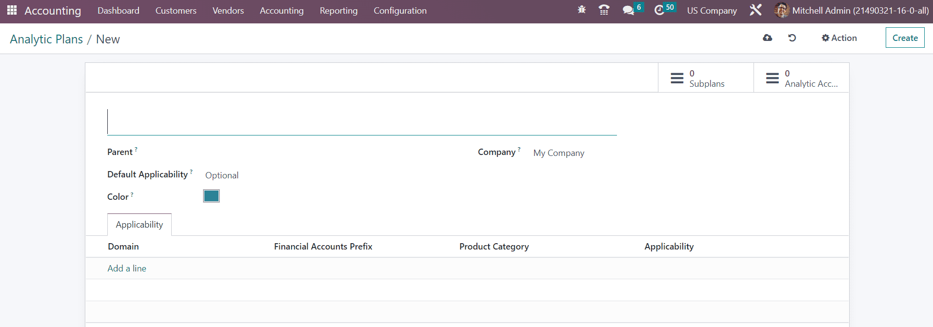 After mentioning a name for the plan, you can set the Parent plan and Default Applicability of the plan in the respective fields. You can select a suitable Color for your plan for identification. The name of your company will be auto-populated in the corresponding field. Under the Applicability tab, you can define the applicability of this plan using the Add a Line button. The Domain can be set as Invoice, Expense, Vendor Bill, Sales Order, Purchase, or Miscellaneous. The prefix mentioned in the Financial Accounts Prefix defines which accounts from the financial accounting this applicability should apply on. Similarly, mention the Product Categories also to apply this analytic plan. You can set the Applicability as Mandatory, Optional, or Unavailable. In order to add Sub Plans to a parent plan, you can use the smart button available in the window.