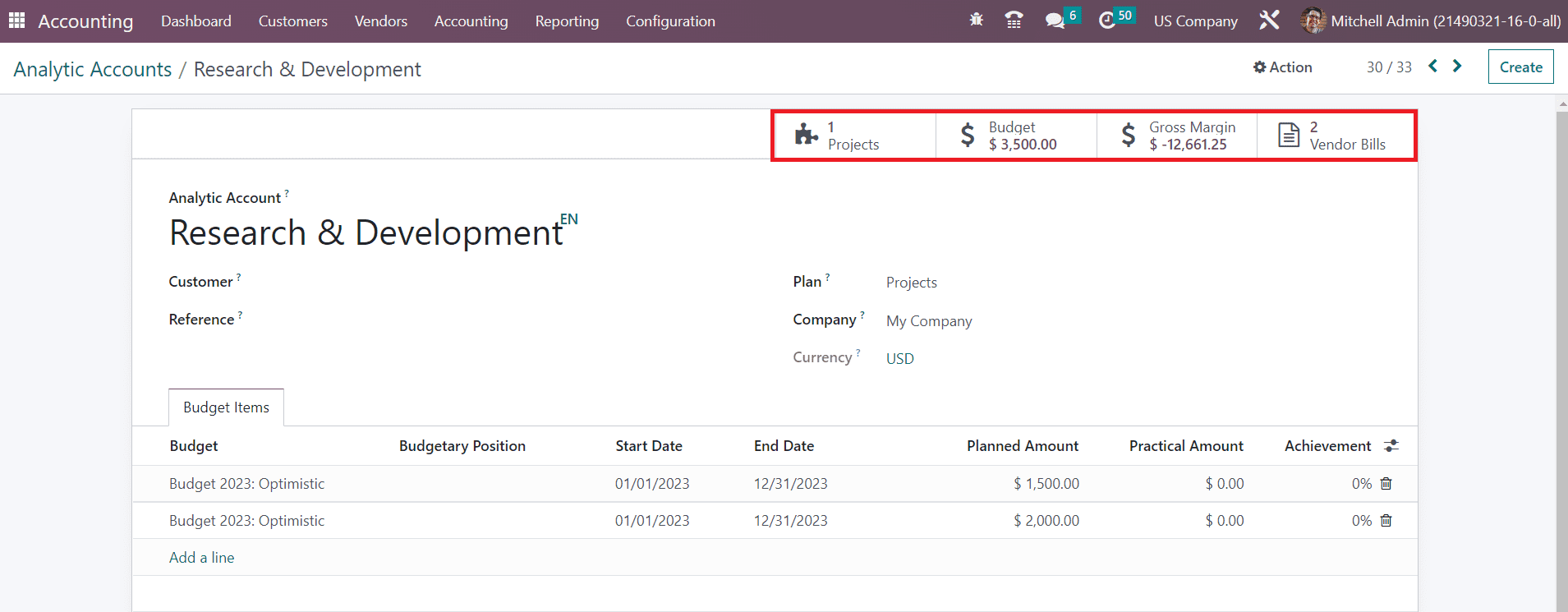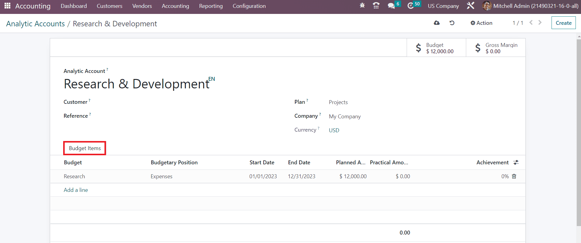 Now, let’s go back to the configuration of the analytic account. Under the Budget Items, you can add Budget plans so that this analytic account can record the cost and revenue of the items included in the budget.