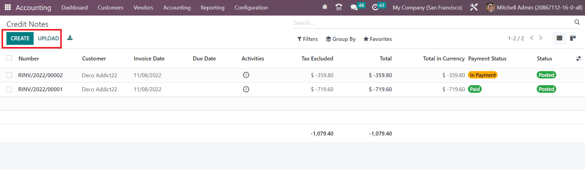 The view of this platform is the same as that of the Invoice platform. You can observe already generated credit notes here. The Upload button will be available to upload documents related to a credit note. For the manual creation of the Credit Note, you can click on the Create button