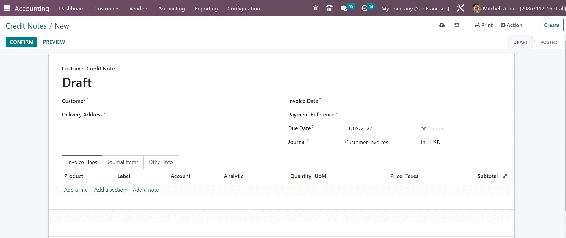 You can create a new credit note here by following the steps we discussed in the creation of a new invoice. Using the Confirm button you can confirm the credit note and later register the payment after paying the amount to the respective customer.