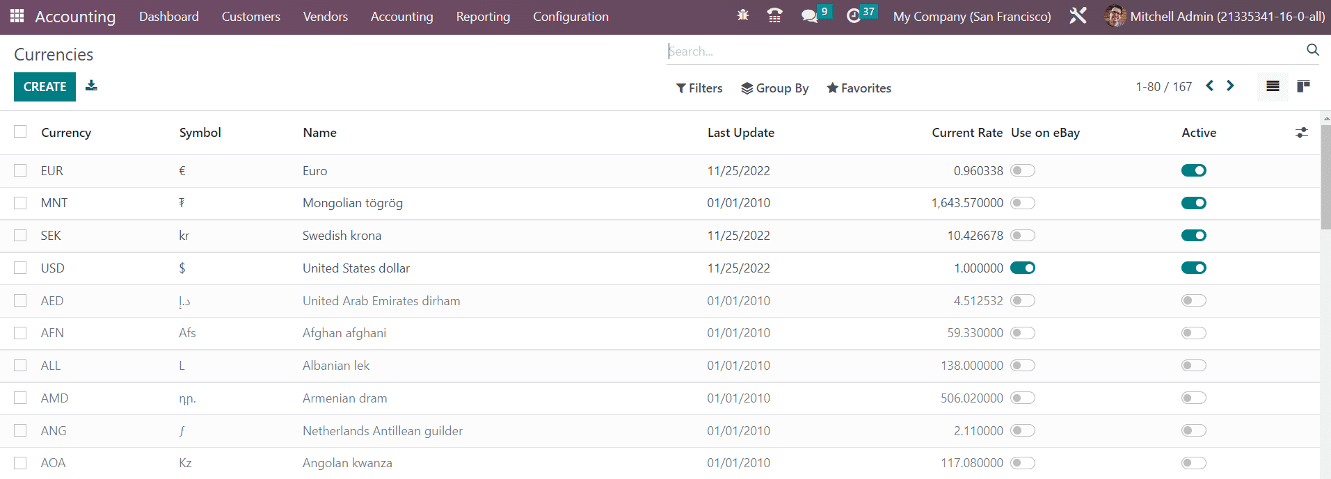 Odoo provides multi-currency support for its users so that they can extend their businesses in international markets also. You can configure multiple currencies in your system using the Currencies option from the Configuration menu. The window displays all available currencies in your system with the details of the Symbol, Name, Last Update, Current Date, Use on eBay status, and Active status.