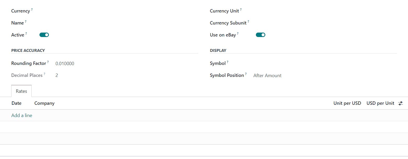 Under the Display section, you can specify a Symbol for the currency to use when printing amounts. The Symbol Position determines where the currency symbol should be placed. It can be either after or before the amount. The rates of the currency according to the main currency of your company can be added under the Rates tab using the Add a Line button.