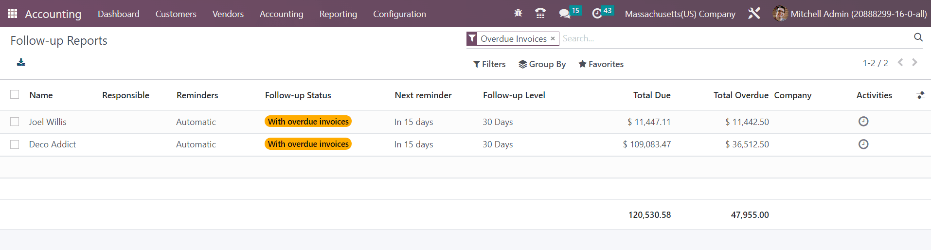 The list view of the reports gives details regarding the Name, Responsible, Reminders, Follow-up Status, Next Reminder, Follow-up Level, Total Due, Total Overdue, Company, and Activities.