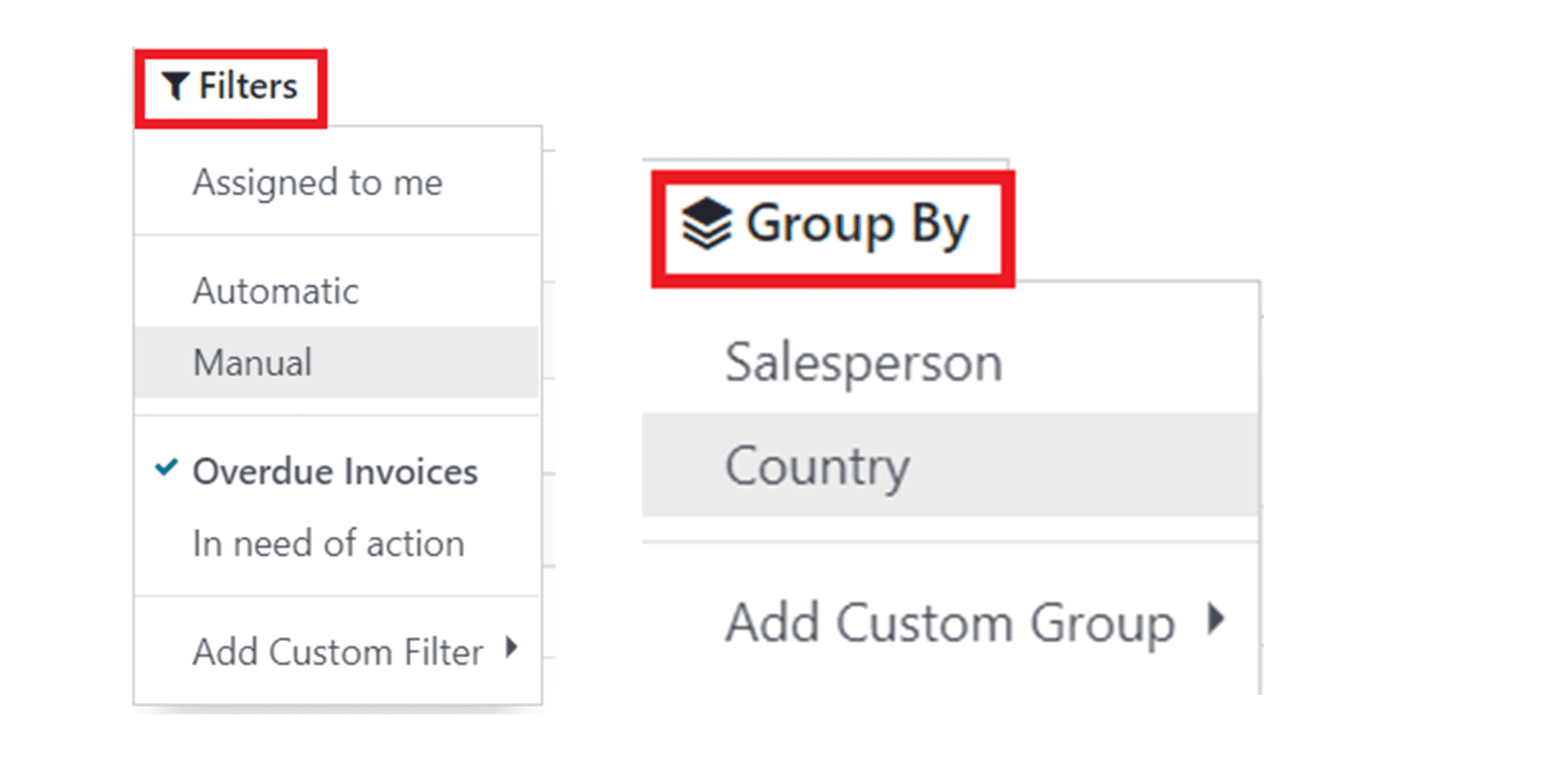 You can use default as well as customizable Filters and Group By options as sorting options highlighted in the screenshot above.