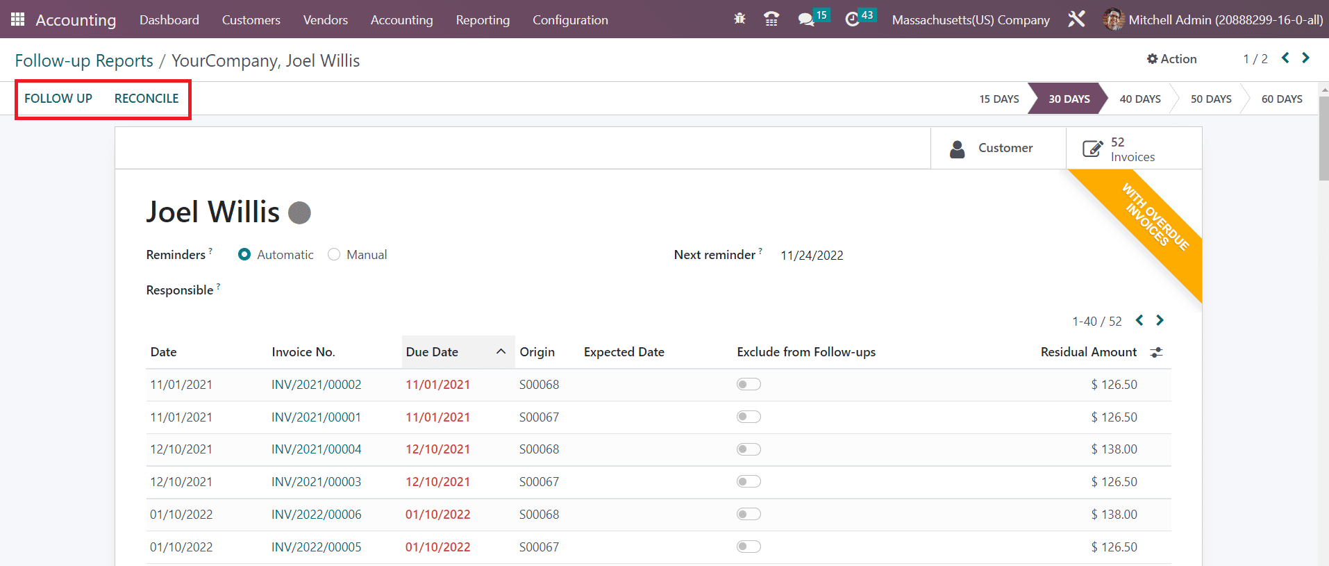 You can take follow-up action by clicking on the Follow-Up button. You will get an automated mail to send a reminder to the customer with the attachments of the corresponding overdue invoices.