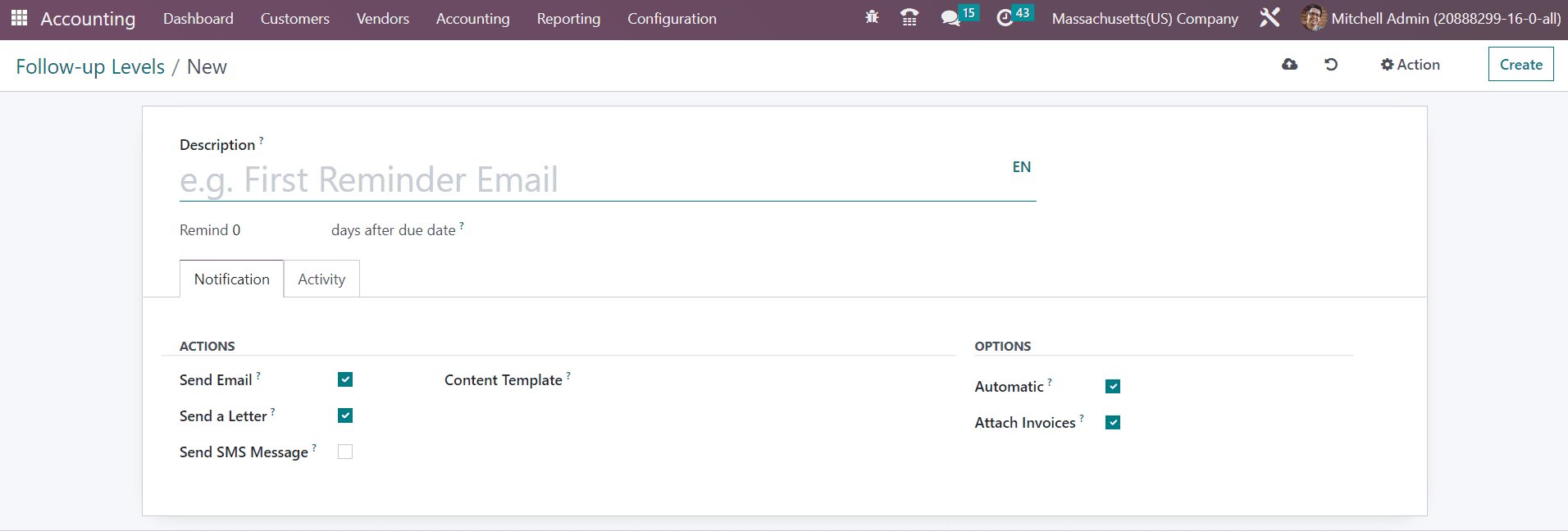 Under the Notifications tab, you can enable the Actions to be taken as follow-up activities. By activating the Send Email and Send a Letter buttons, you will get an additional field called Content Template where you can mention the content template for the mail and letter. Similarly, activating the Send SMS Message gives an additional option to specify the SMS Template. If you want to automate the follow-up activities, you can activate the Automatic option. The Attach Invoices feature can be enabled to attach overdue invoices by email.