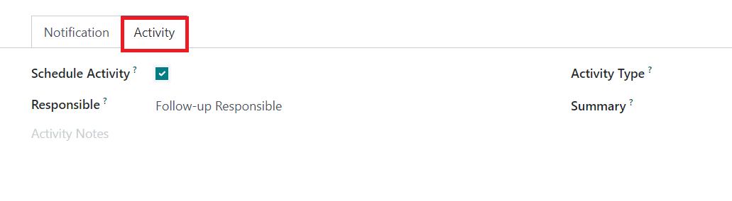 The Activity tab shows the Schedule Activity option to activate if you want to plan scheduled activities on the follow-up reports.