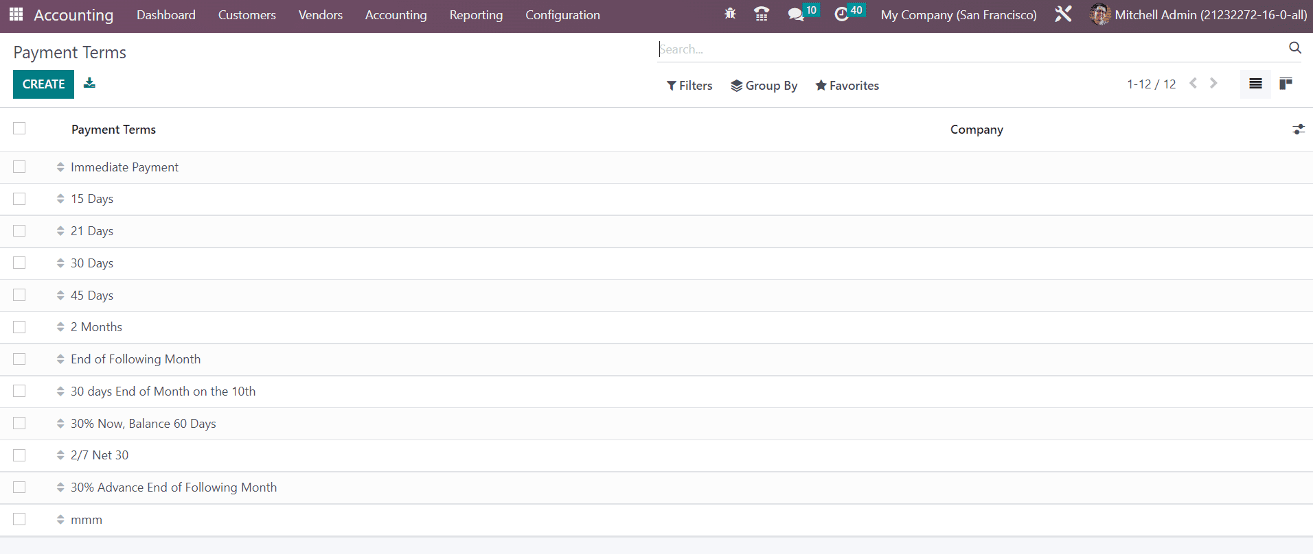 In the Configuration menu of the Accounting module, you can find the Payment Terms option under the Invoicing tab. As shown in the screenshot below, you will get the list of already configured payment terms here with the details of their name and Company.