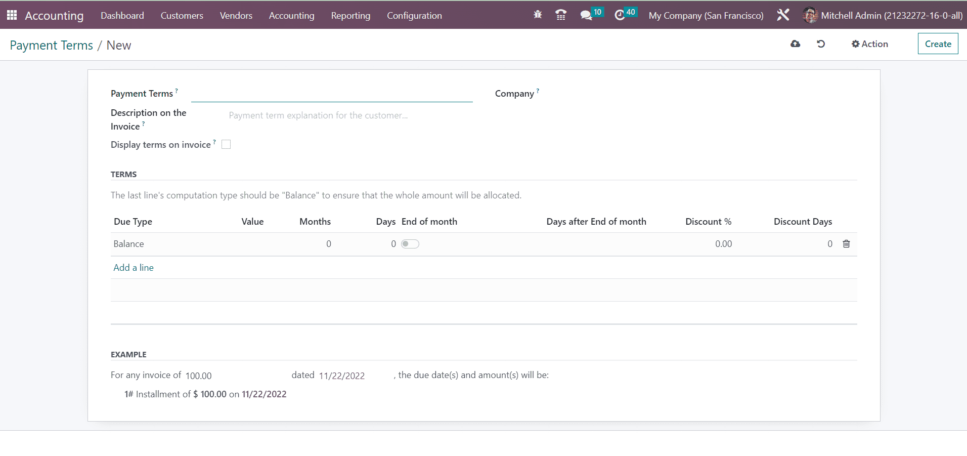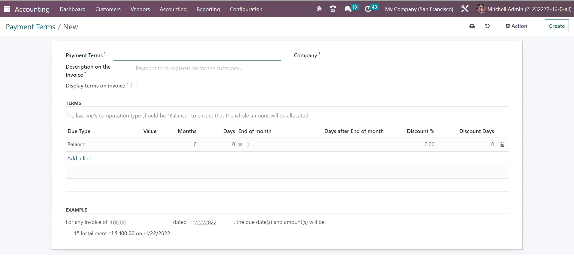 Each business organization has its own payment-making and payment-collection methods and strategies. According to your company policies, you can make different payment terms and use them while creating customer bills and vendor bills. The payment terms will define the conditions under which a payment is completed. Using payment terms on sales orders, customer invoices, vendor bills, and contracts will help you to get the due dates automatically. This feature is especially useful for installment payments.