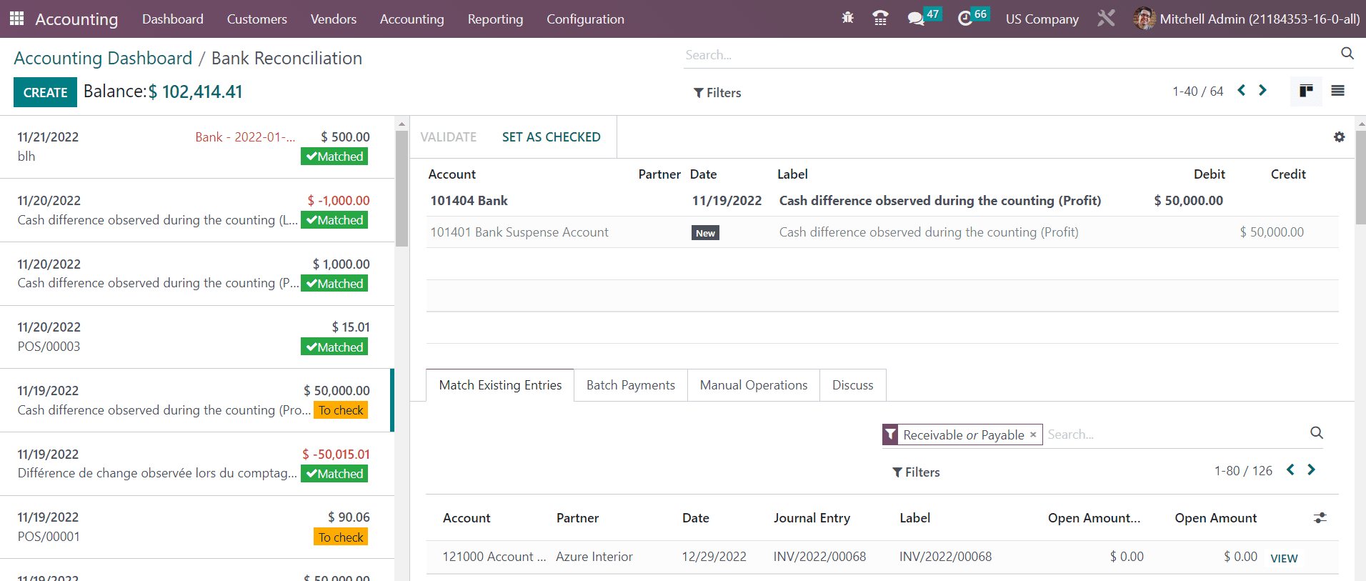 You can observe the bank statement reconciliation in this window. On the left side of the screen, the statements can be seen as arranged based on the accounting date. You can see the ‘Matched’ label on the statements which indicate that the statements are already matched with bank accounts. The statements which need to be checked and reconciled will be labeled as ‘To Check’.