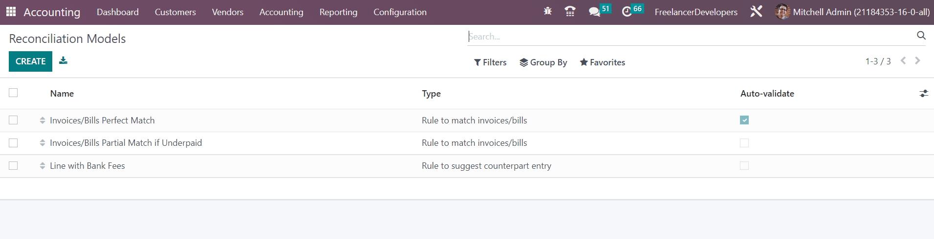 The already available reconciliation models can be seen in this window with the details of the Name, Type, and Auto-validate status. Use the Create button to get a new configuration window.