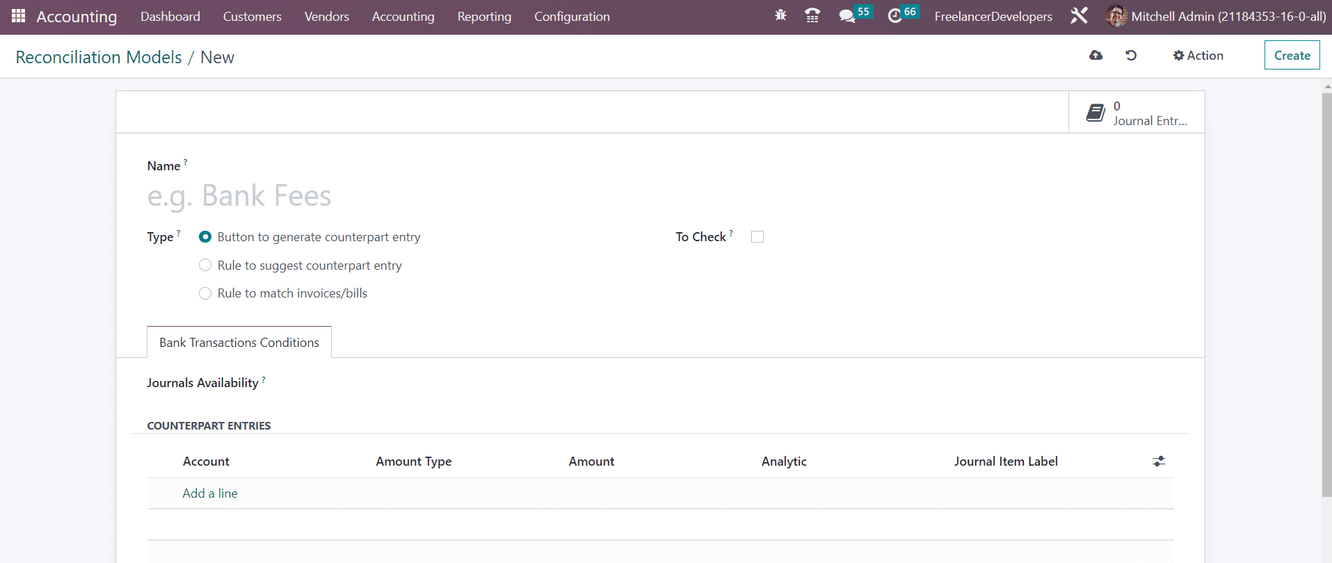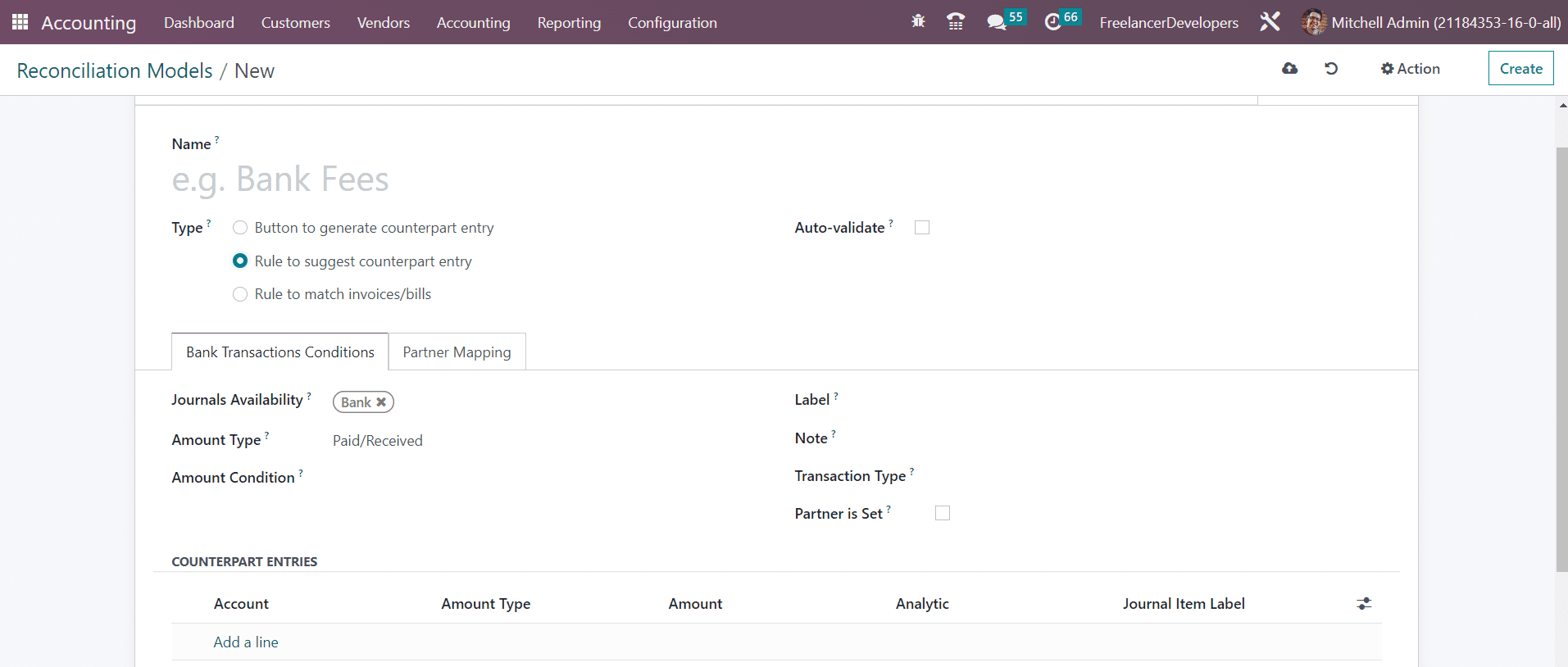 Here, you will get the Auto-Validate option to activate to validate the statement line automatically. After mentioning the Journal Availability, you can select a suitable Amount Type from the given options which are Received (only applied when receiving an amount), Paid (only applied when paying an amount), or Paid/Received (applied in both cases). By doing so, the reconciliation model will be only applied to the selected transaction type. In the Amount Condition, you can mention a specific amount and the reconciliation model will be applied when the amount is lower than, greater than, or between the specified amount. You can set rules for Label, Note, and Transaction Type as Contains, Not Contains, or Match Regex. By activating the Partner is Set field, the reconciliation model will be applied only when a customer/vendor is set. By activating this option, you will be able to get additional fields to mention the Matching Partners and Matching Categories. Add Counterpart Entries in the given space using the Add a Line button.