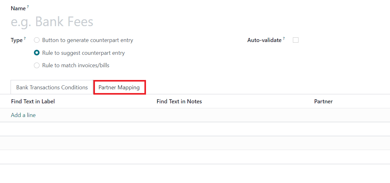 Under the Partner Mapping tab, you can add Find Text in Label, Find Text in Notes, and Partner using the Add a Line button.