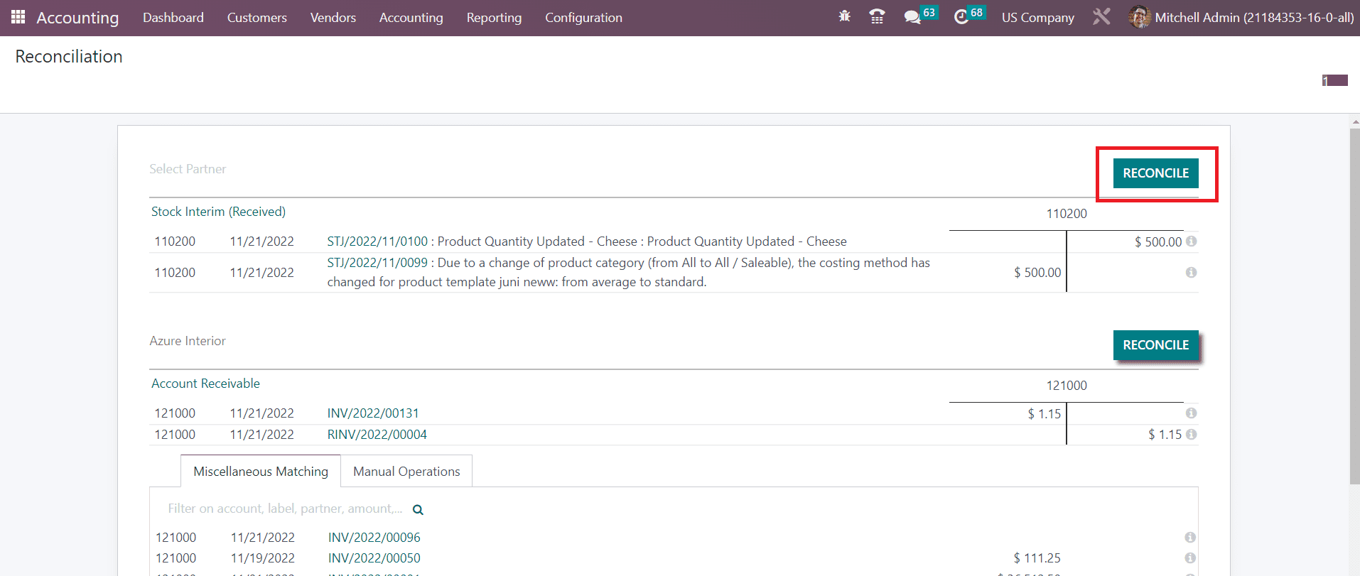 Here, you can use the Reconcile button to perform the reconciliation of statements with bank accounts.