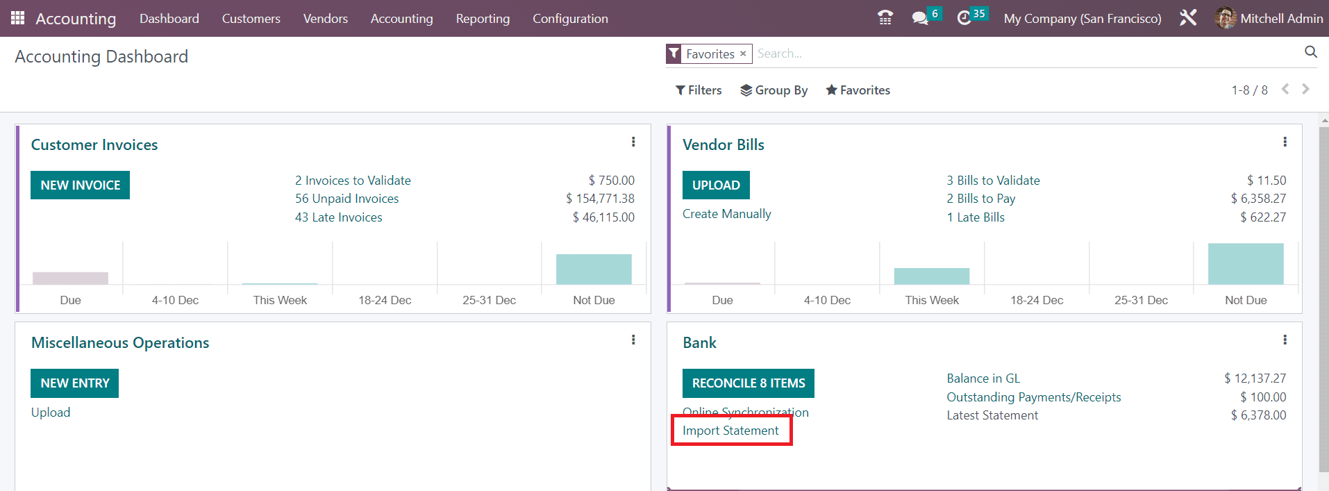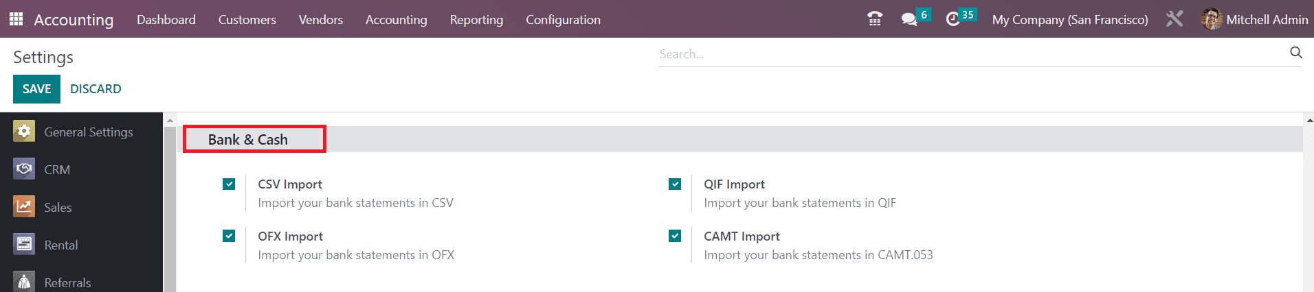 From the Accounting Dashboard of the module, you can easily import bank statements to your system, which can be used for the reconciliation process later. You can import your bank statements in CSV, OFX, QIF, and CAMT based on the option you activate from the Settings menu of the Accounting module.