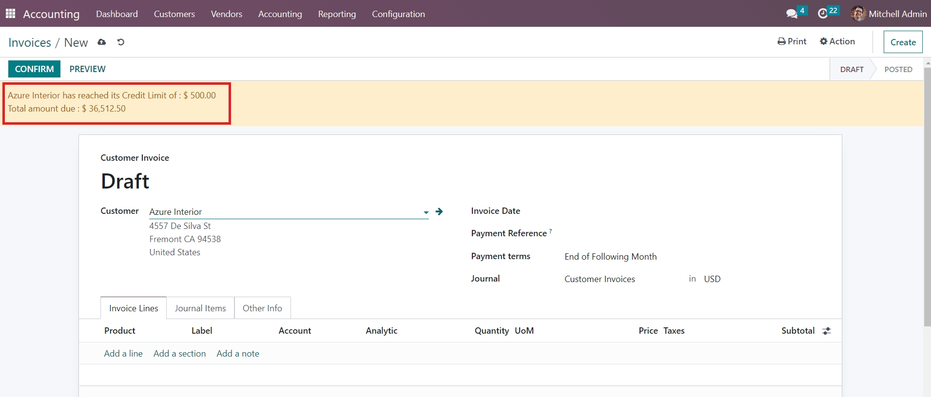 Now, let’s check what will happen once you create an invoice or sales order for a partner whose credit limit has already exceeded SAR 500.