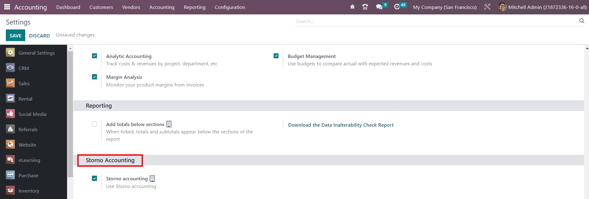 Storno Accounting is a newly introduced accounting feature in Odoo. In this method of accounting, it will use negative credit or debit amounts recorded in your account to reverse the original journal entries. With the assistance of this practice, it is possible to cancel a file having incorrect accounting information related to the recorded amount.