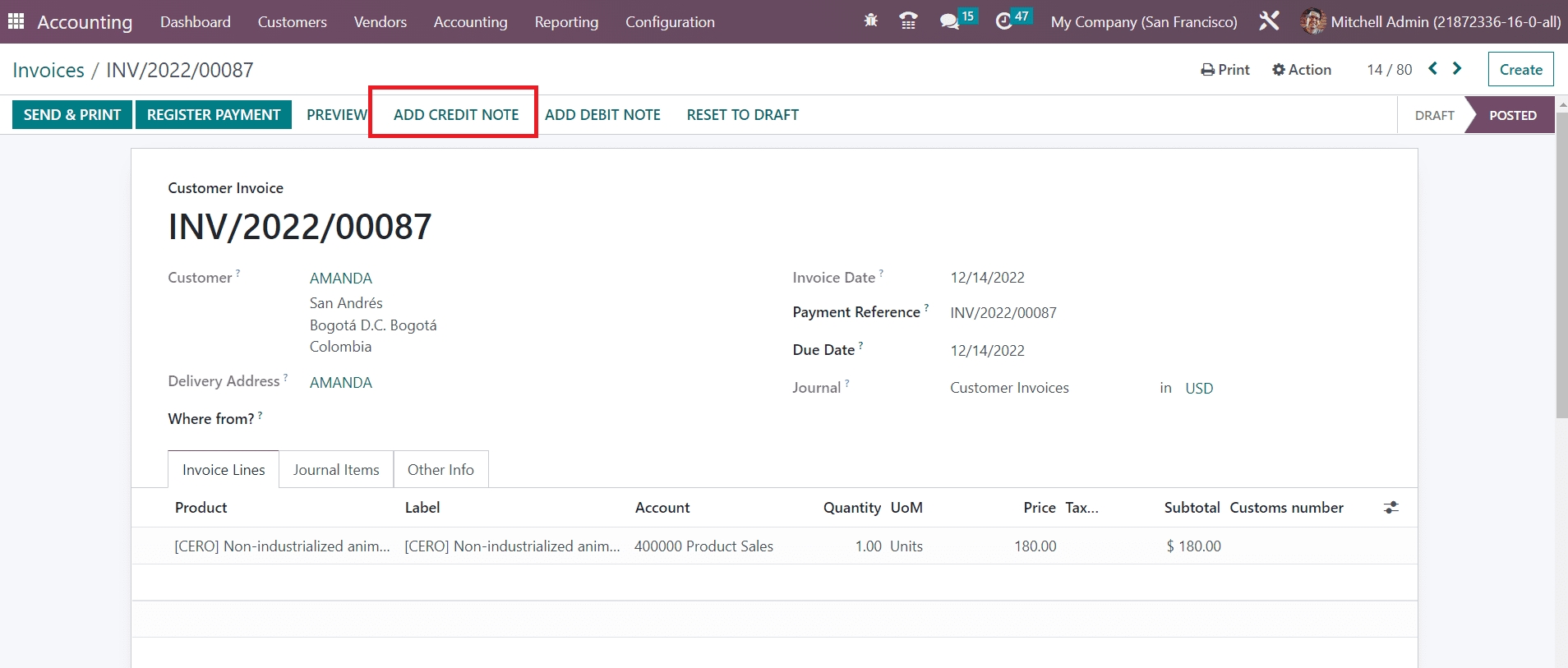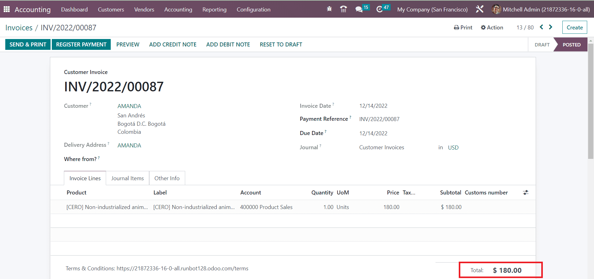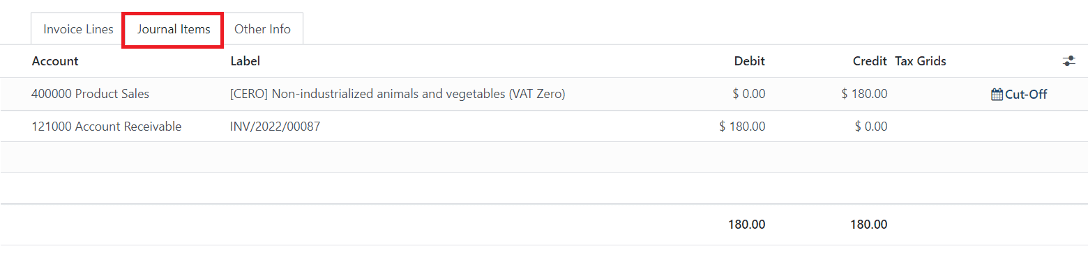 The screenshot shows the invoice for the amount of $180. The journal items for this invoice can be seen under the respective tab, as shown below.