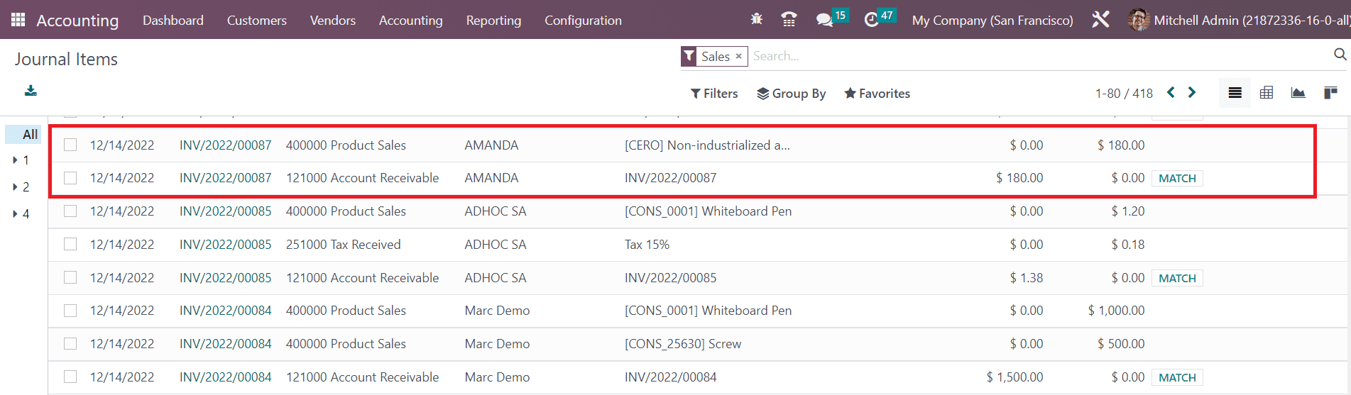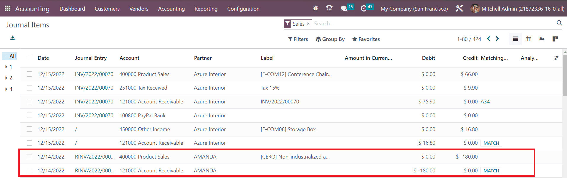 While checking the Journal Items in your Accounting module, you can find the posted journal items for the amount as shown below.