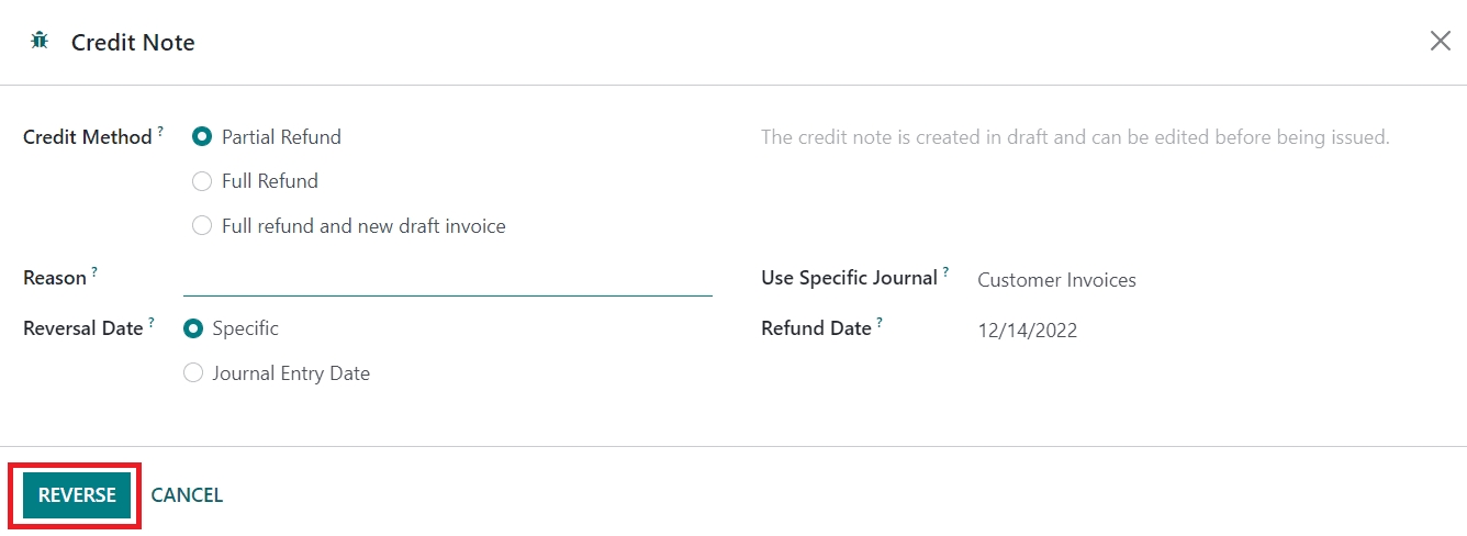 After mentioning the necessary details, you can click on the Reverse button. The posted journal entry will be reversed, and the amount will be recorded in the journal items with a negative sign, as shown below.