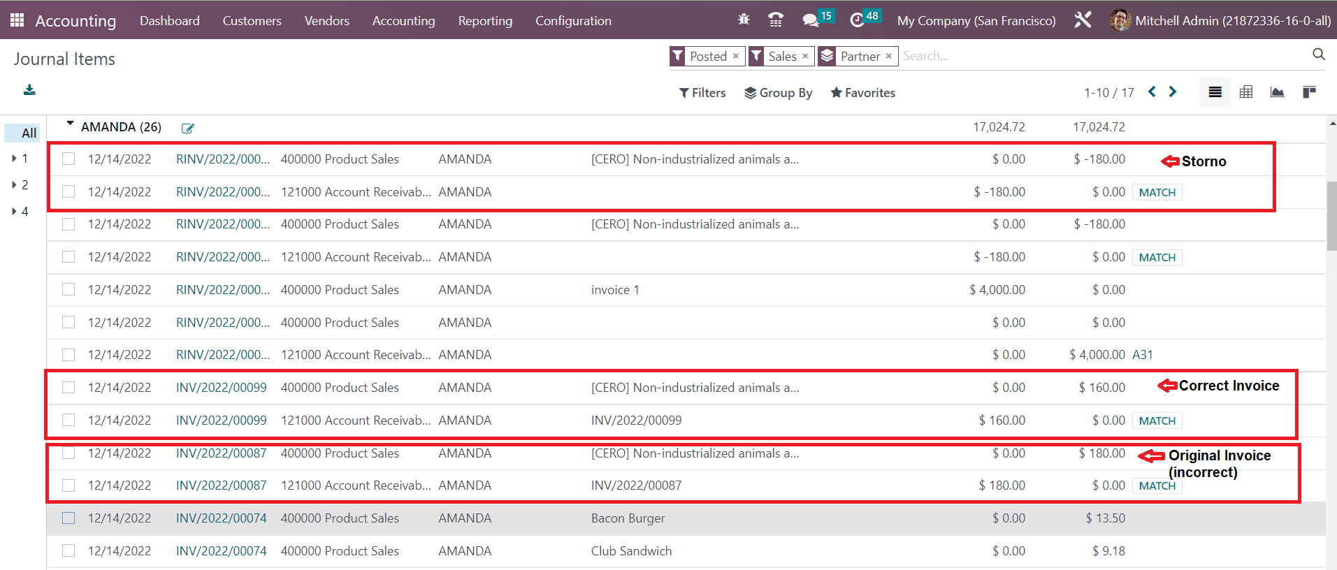 The journal items of the incorrect invoice, Storno, and correct invoice can be seen in the Journal Items menu of the Accounting module, as shown in the image above.