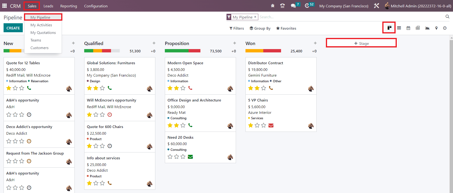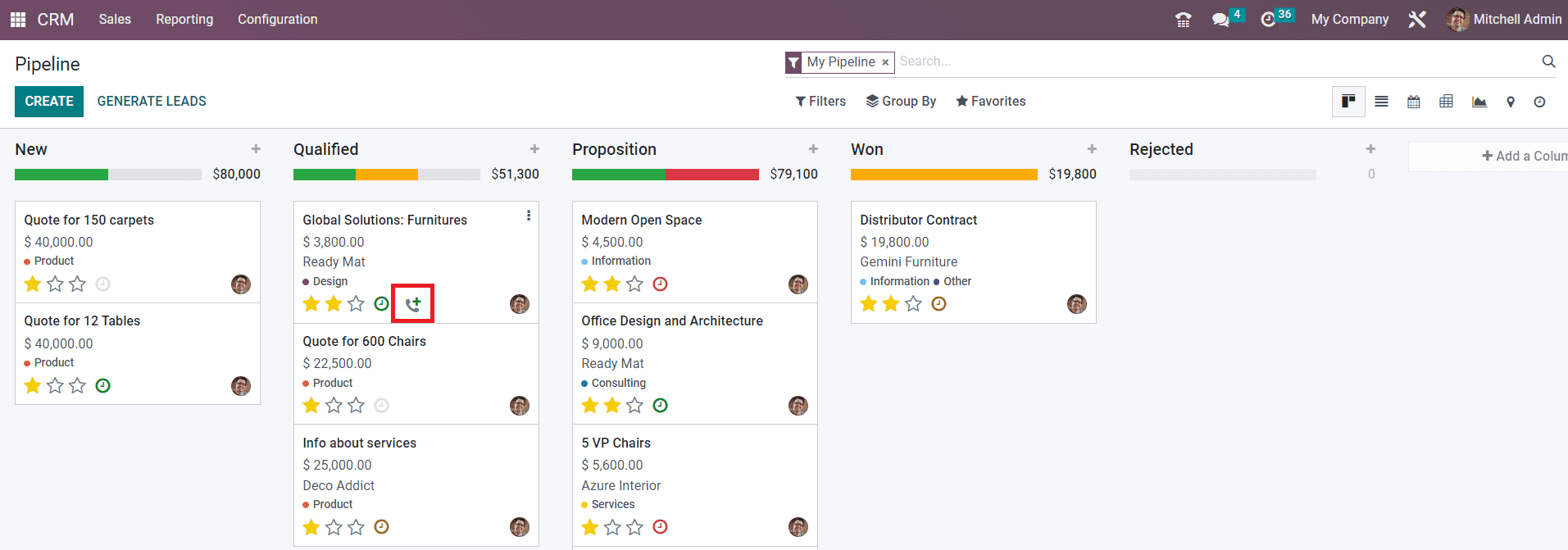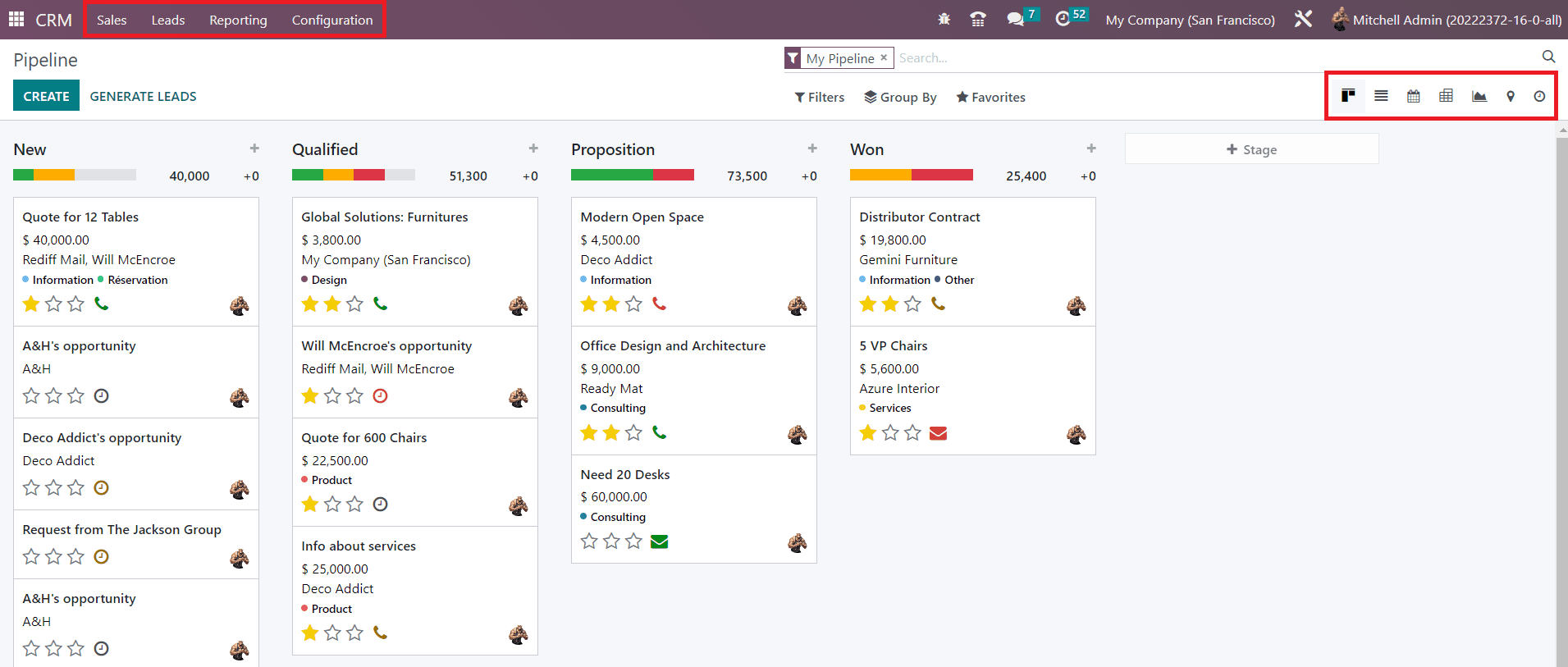 The screenshot shown below includes the stages such as New, Qualified, Proposition, and Won. As the titles of the stages indicate, all new leads will appear under the New stage. Among the new leads, only qualified leads based on certain criteria will be moved to the next stage called Qualified. The successful business leads can be moved to the stage Won after getting confirmation from the corresponding customer.