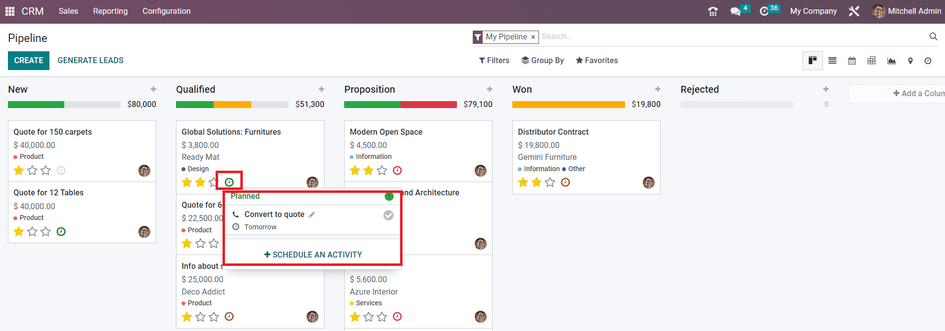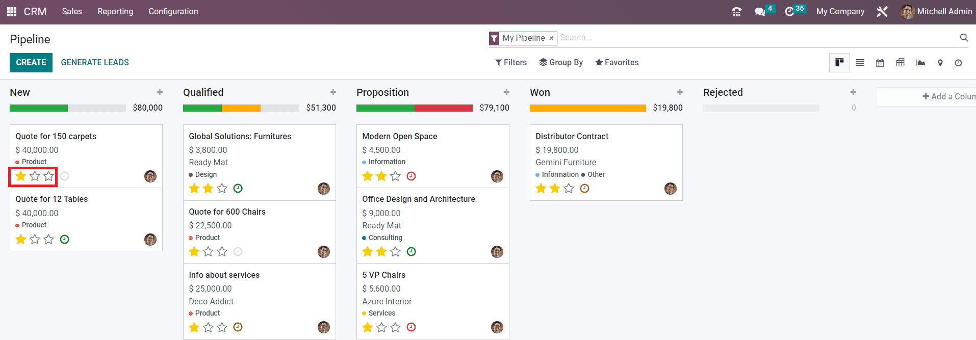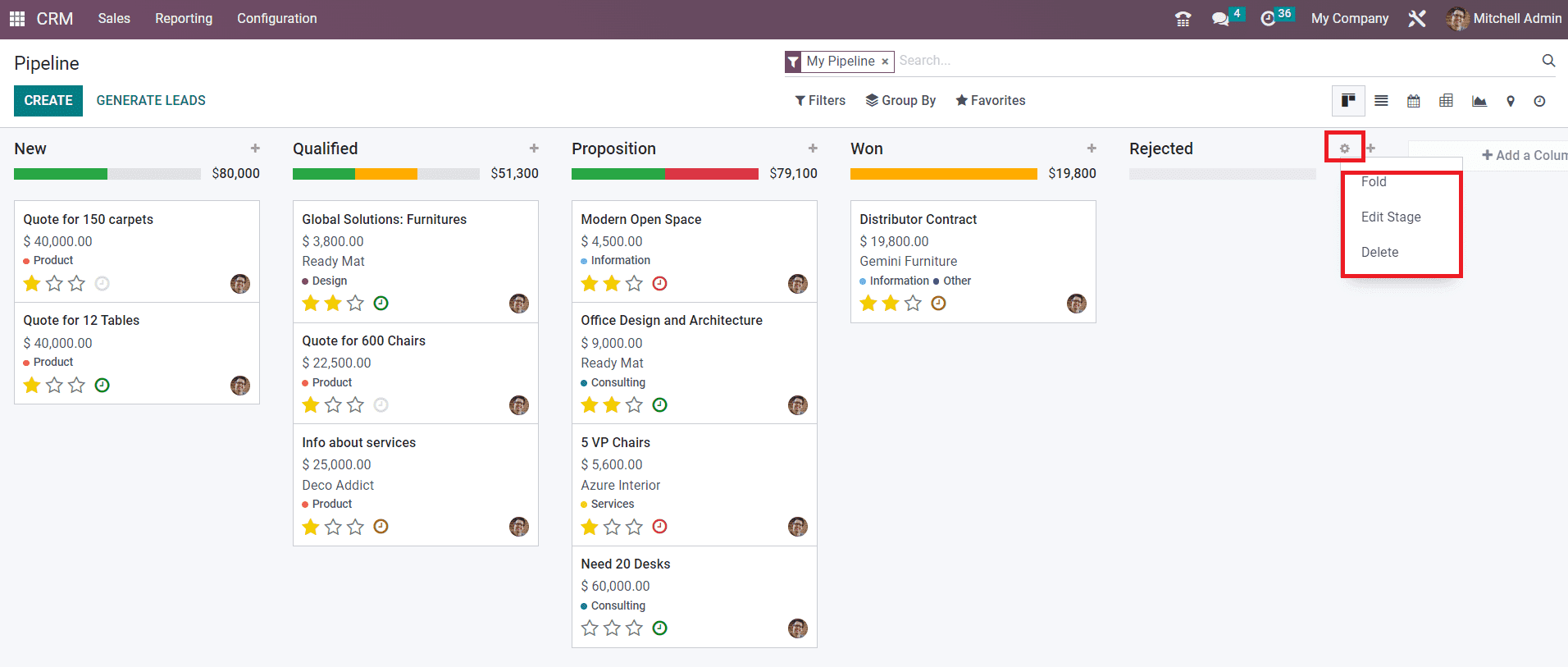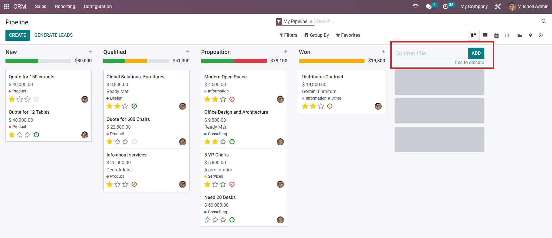 The screenshot shown below includes the stages such as New, Qualified, Proposition, and Won. As the titles of the stages indicate, all new leads will appear under the New stage. Among the new leads, only qualified leads based on certain criteria will be moved to the next stage called Qualified. The successful business leads can be moved to the stage Won after getting confirmation from the corresponding customer.