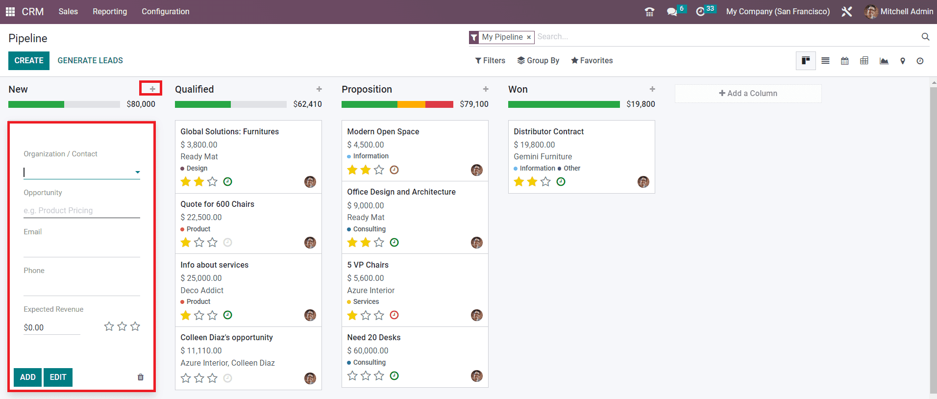 You can quickly add new leads under each stage using this option. Mention the name of the Organization/Contact in the given space. Along with this, you can add the title of the Opportunity, Email, Phone, and Expected Revenue in the respective fields. Clicking on the Add button will add the new lead to the corresponding stage. If you want to make changes to the lead details, you can use the Edit button.