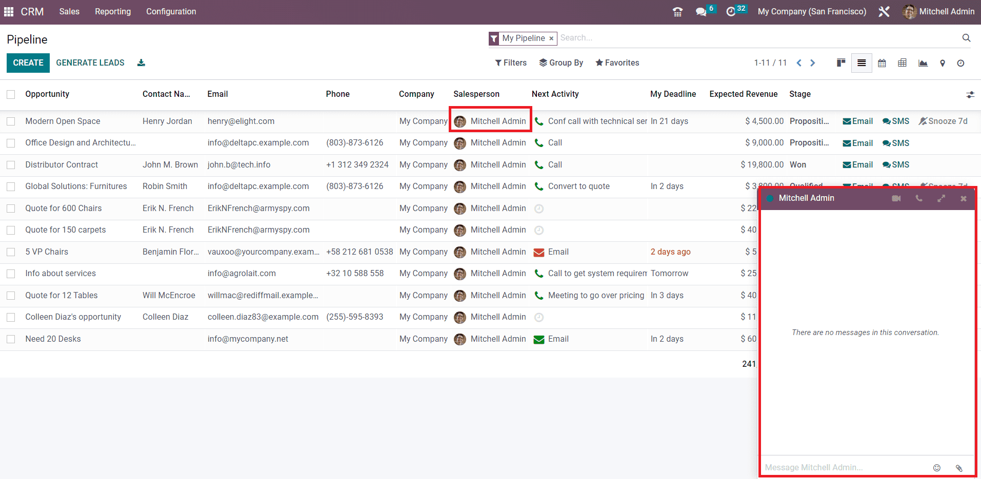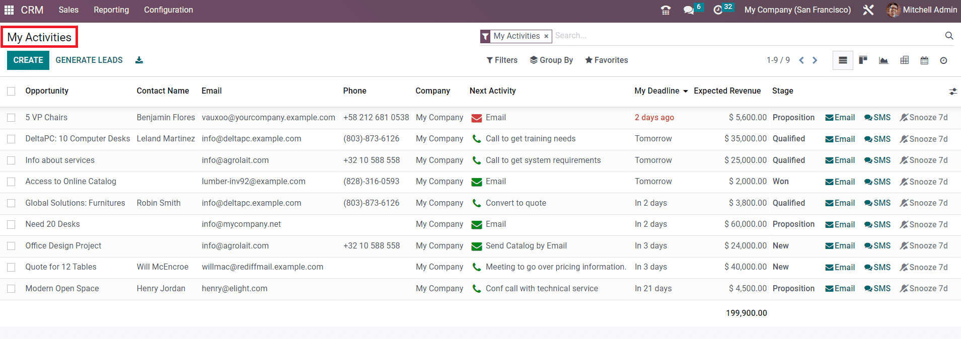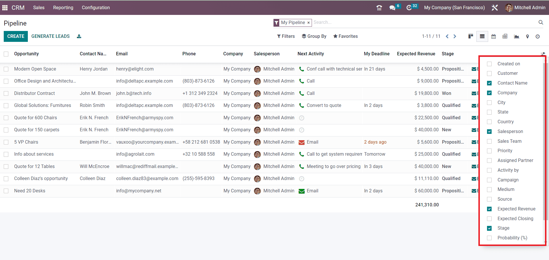 When we take a look at the List view of the CRM pipeline, you will get an advanced preview along with the details of the Opportunity, Contact Name, Email, Phone, Company, Salesperson, Next Activity, My Deadline, Expected Revenue, and Stage.