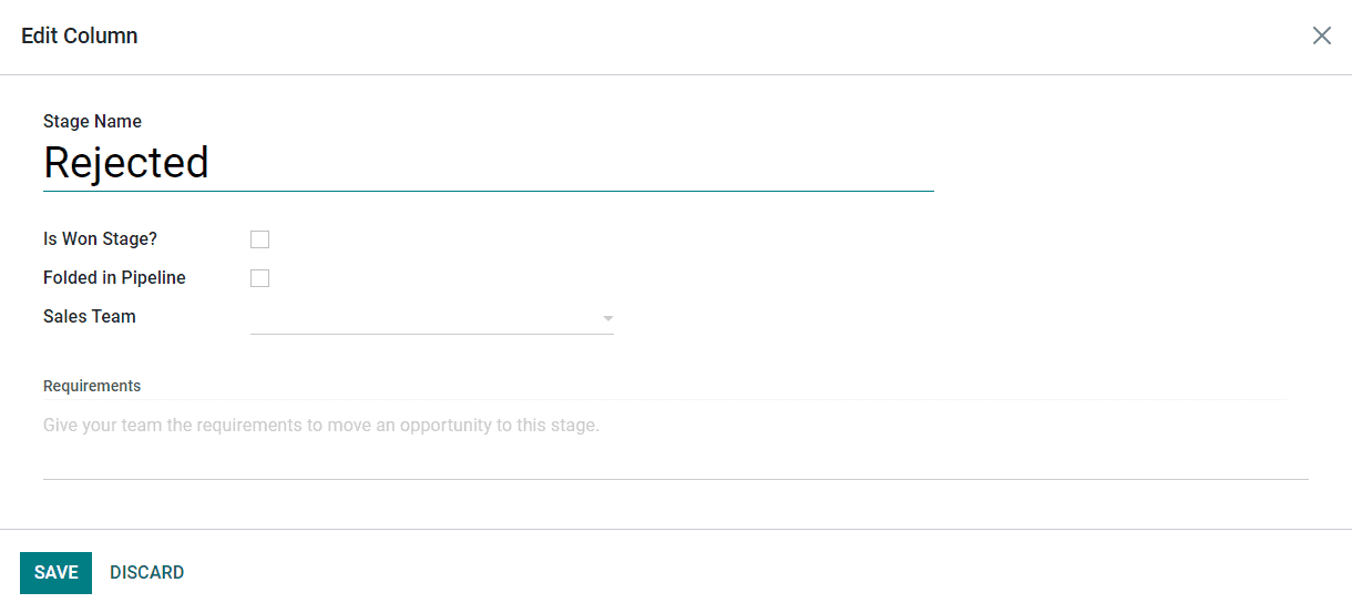 If you want to consider the selected stage as the Won Stage for leads, you can activate the field Is Won Stage?. It is possible to fold the corresponding stage in the kanban view by activating the Folded in Pipeline field. In the Sales Team field, you are allowed to mention a particular sales team who uses this stage. Other sales teams will not be able to see or use this stage than mentioned in the given field. The requirements to move leads to this stage can be specified in the Requirements field so that the team members will get an exact idea regarding the needs of this particular stage. After editing the column, don't forget to click on the Save button to record all new changes.