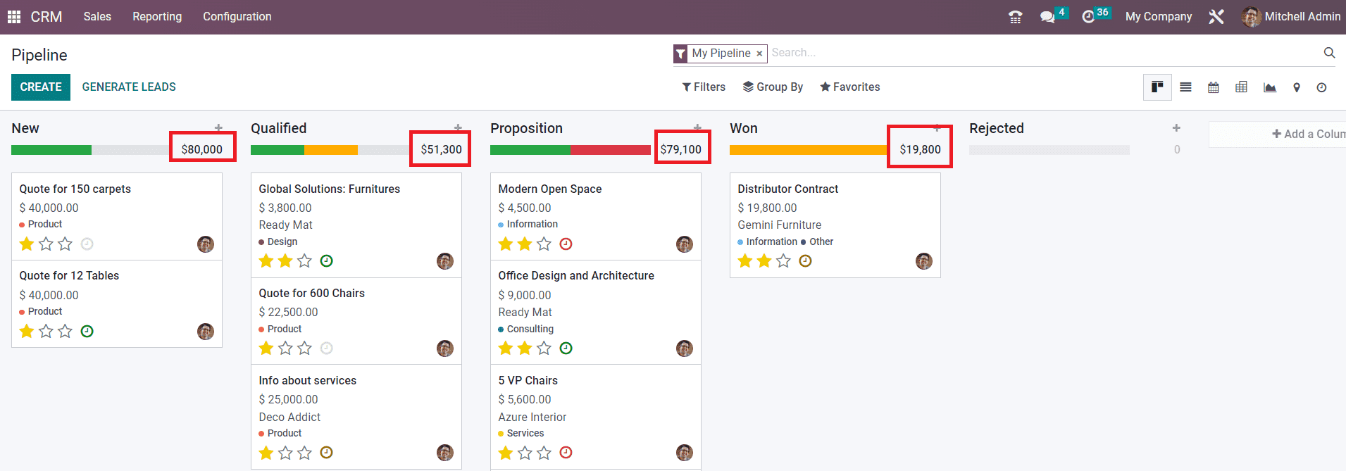 The expected revenue from each stage can be seen in the top right corner of the corresponding columns as highlighted in the image above. You can change stages of leads by using the drag and drop feature. By changing the stage of one lead, the expected revenue will be automatically updated based on the new record.