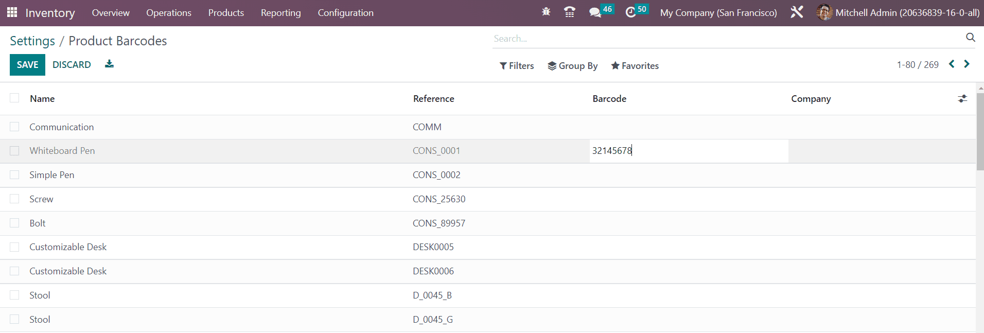 Odoo will lead you to a new platform where you will get the list of already configured products in your database. You can easily add Barcode to each product by clicking on the Barcode field of the respective product. After adding a barcode to the product, you can click on the Save button. You can assign barcodes for all products by this method. Using this barcode you can locate products during different inventory operations with the help of a barcode scanner.
