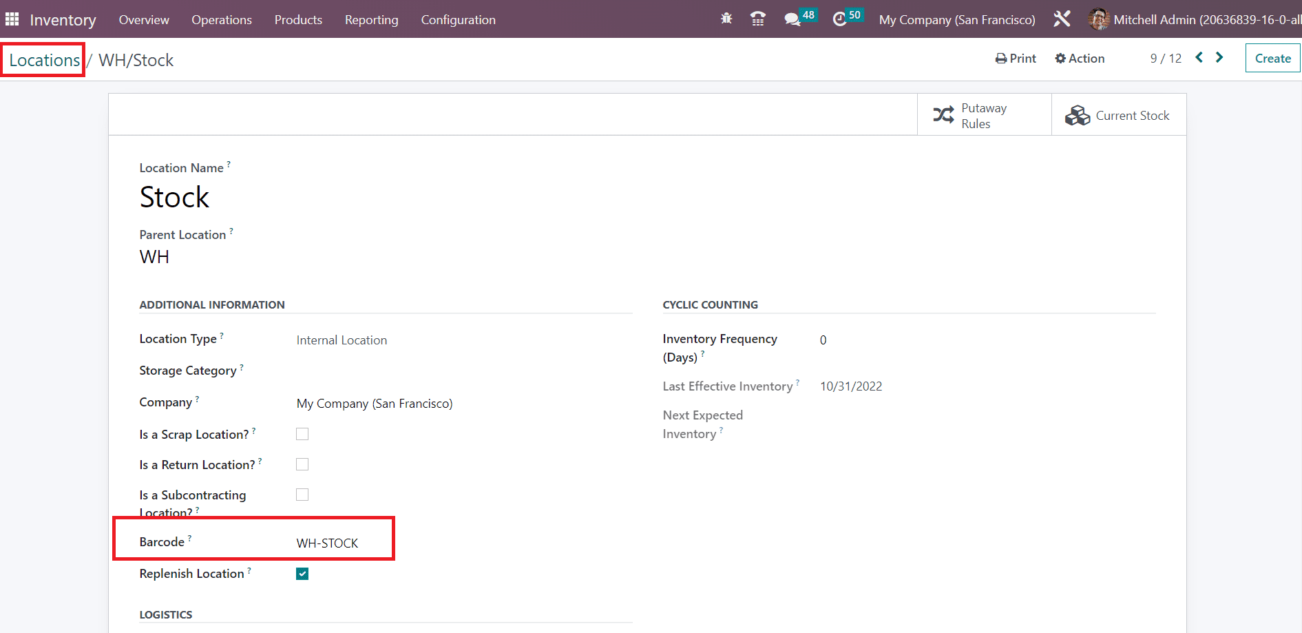 It is possible to create a barcode for storage location also. While configuring locations in Odoo, you will be able to get the Barcode field to set the location barcode as shown in the image below.