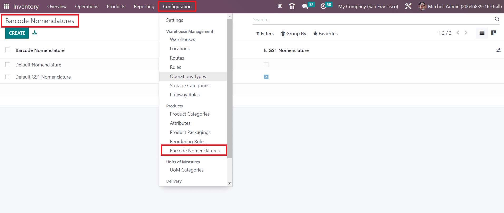 You can set certain rules for the creation of the barcode with the help of the Barcode Nomenclature feature available in the Odoo ERP system. In order to set the barcode nomenclature in the Odoo Inventory module, you must activate the developer mode. Once you change into developer mode, you can find the Barcode Nomenclature option under the Configuration menu of the Inventory module as shown below.