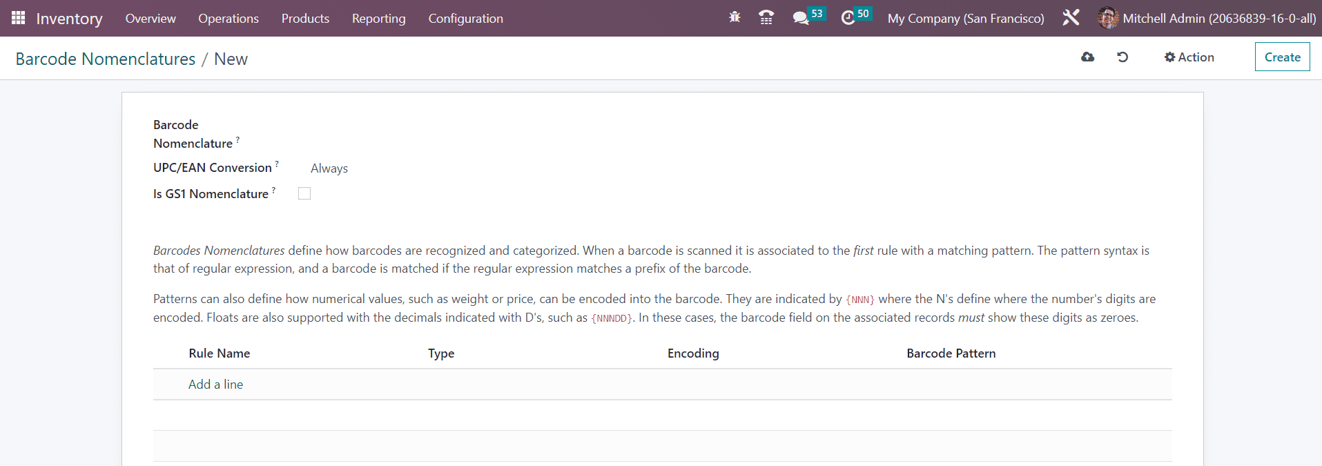 Using the Create button, let’s create a new Barcode Nomenclature.