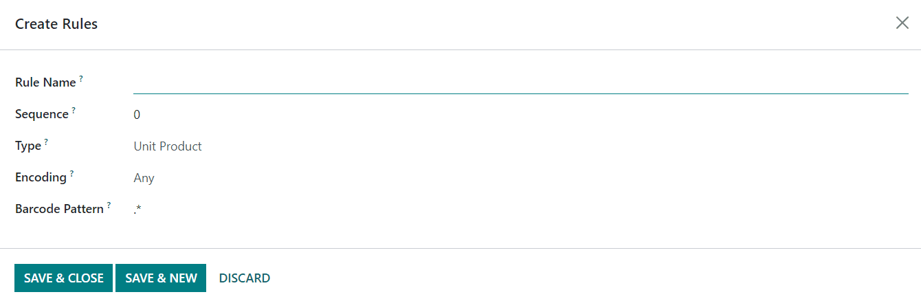 Here, you can set a Rule Name, Sequence (used to order rules such that rules with a smaller sequence match first), Type, Encoding, and Barcode Pattern. You can add different rules to the nomenclature by this method.