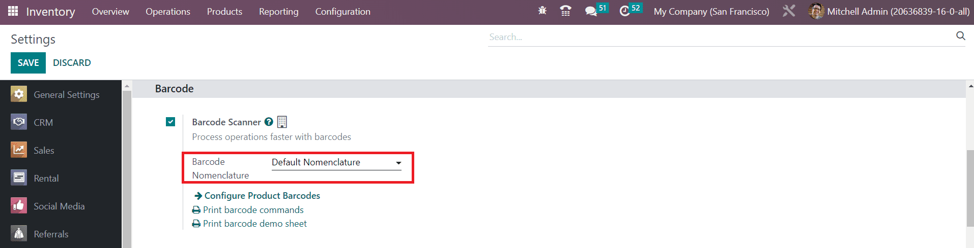 After configuring the Barcode Nomenclature, you can define which nomenclature should be used while creating barcodes in the Inventory module from the Settings menu.