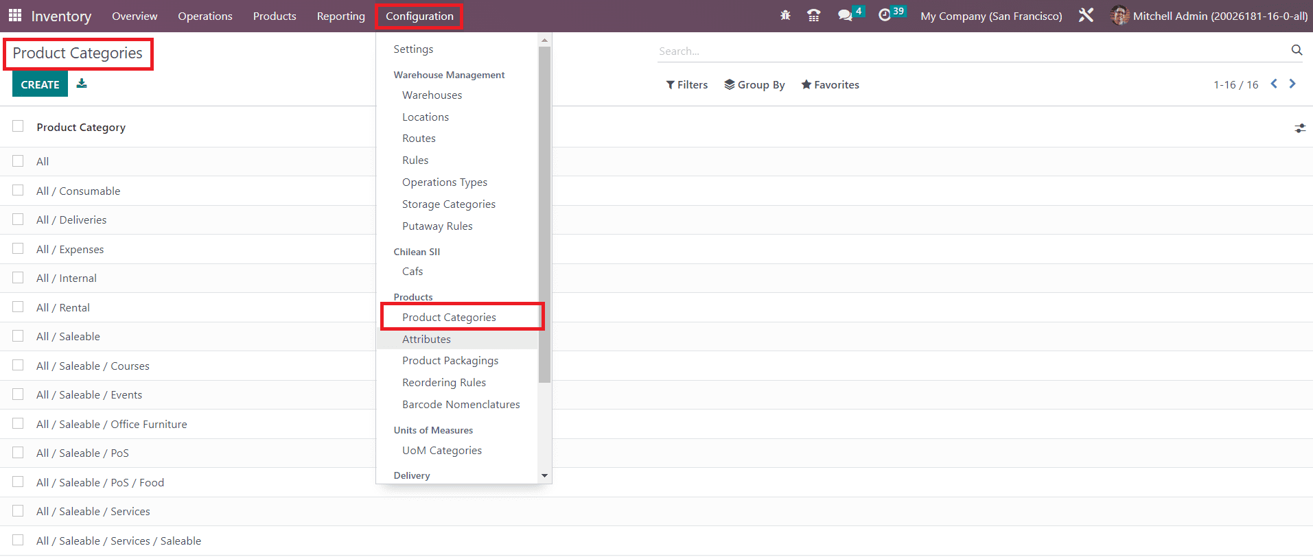 You can categorize your products using the Product Categories feature available in the Odoo Inventory module. In order to perform various kinds of product operations, it is essential to define product categories in Odoo. Odoo will make the products easier to find because it allows you to filter by product categories. The user will get access to the Product Categories window from the Configuration menu of the Inventory module as shown below.