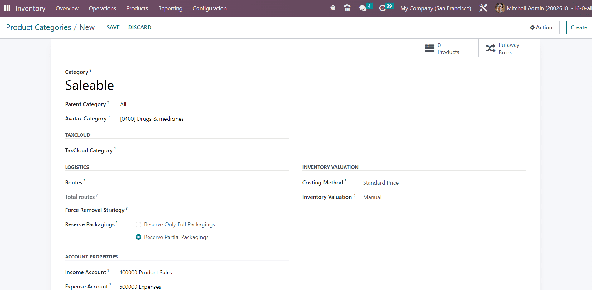 The name of the new category can be specified in the given field along with the details of its Parent Category and Avatax Category. In the Taxcloud tab, you can mention the TaxCloud Category of this product category. It refers to the taxability information codes which are used by TaxCloud to compute specific tax rates for each category. This value is used when no TIC is set on the product. If no value is set here, the default value set in Invoicing Settings is used. Under the Logistics tab, you can define the Routes of operation of this product category. In the Force Removal Strategy field, you can set a specific removal strategy that will be used regardless of the source location for this product category.
