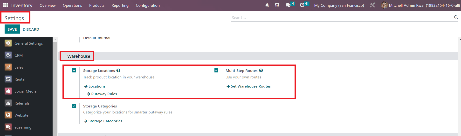 In the Odoo 16 Inventory module, the users will get separate platforms to define suitable rules and routes for the stock movements. The routes in Odoo work associated with the respective storage locations and warehouse operations so make sure to configure both these options before defining routes for inventory. To set up new routes in Odoo, you are requested to enable this feature from the Settings menu of the module. You can find the Warehouse tab as shown below, from where you can activate the Multi-Step Routes.